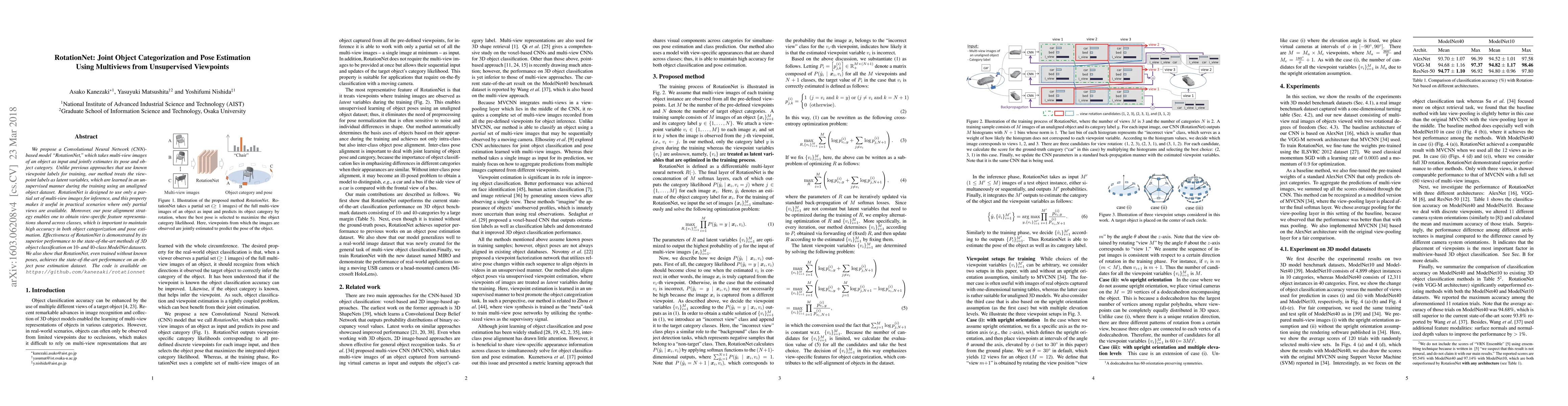 RotationNet is a CNN-based model for joint object categorization and pose estimation using multi-view images without known viewpoint labels. It learns viewpoint labels unsupervised and achieves state-of-the-art performance on 3D object classification and pose estimation datasets.