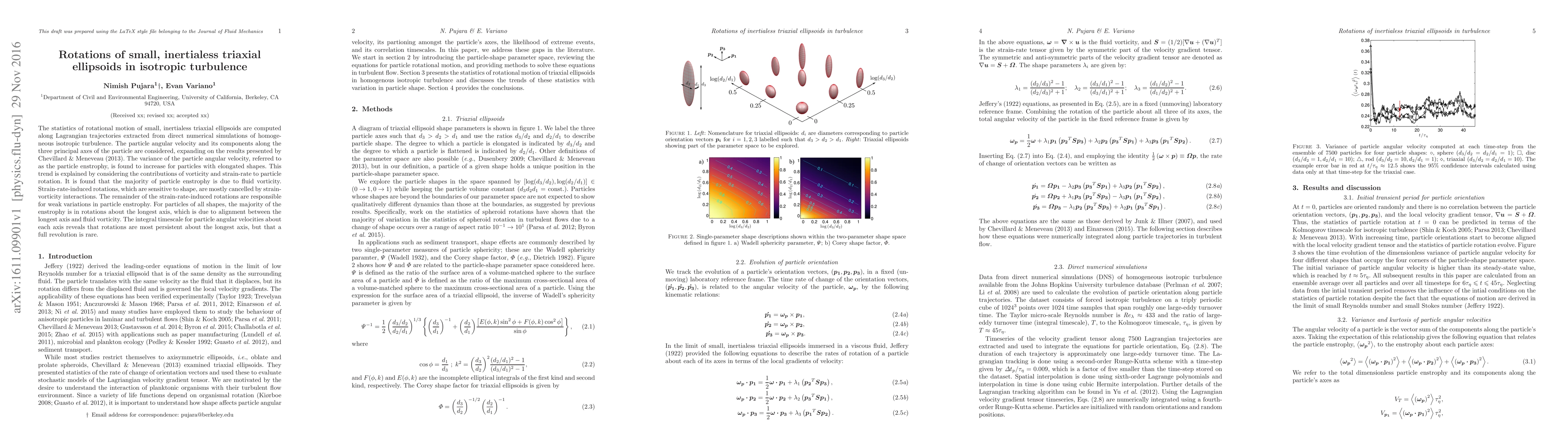This study investigates the rotational dynamics of small, inertialess triaxial ellipsoids in isotropic turbulence, finding that particle enstrophy increases with particle elongation due to fluid vorticity. Strain-rate-induced rotations are largely canceled, leaving minor shape-dependent variations and persistent rotations about the longest axis.