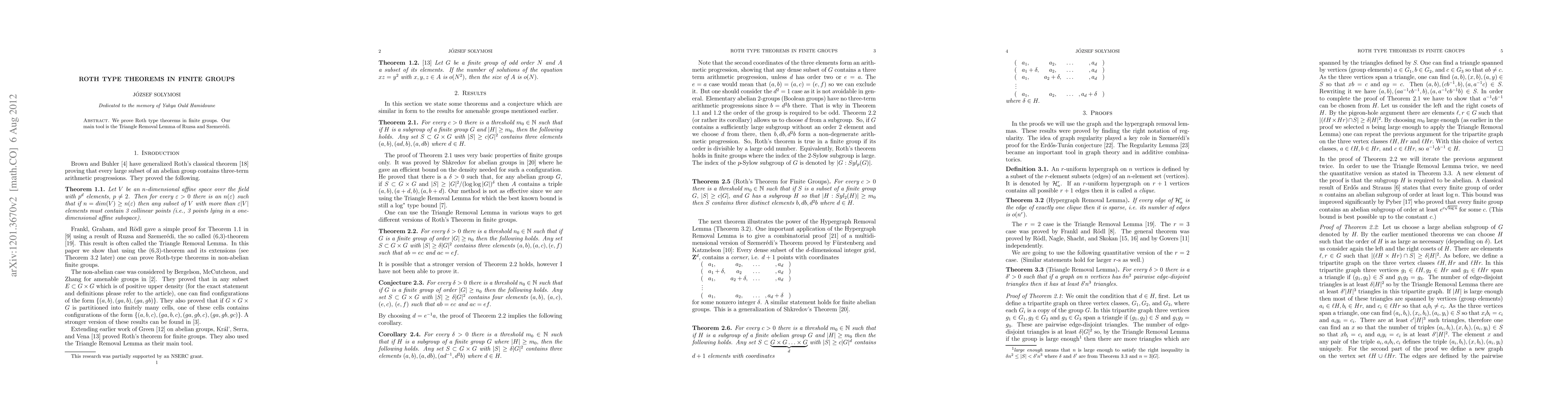 Summary: This paper proves Roth type theorems within finite groups, utilizing the Triangle Removal Lemma developed by Ruzsa and Szemerédi as its primary methodological tool.