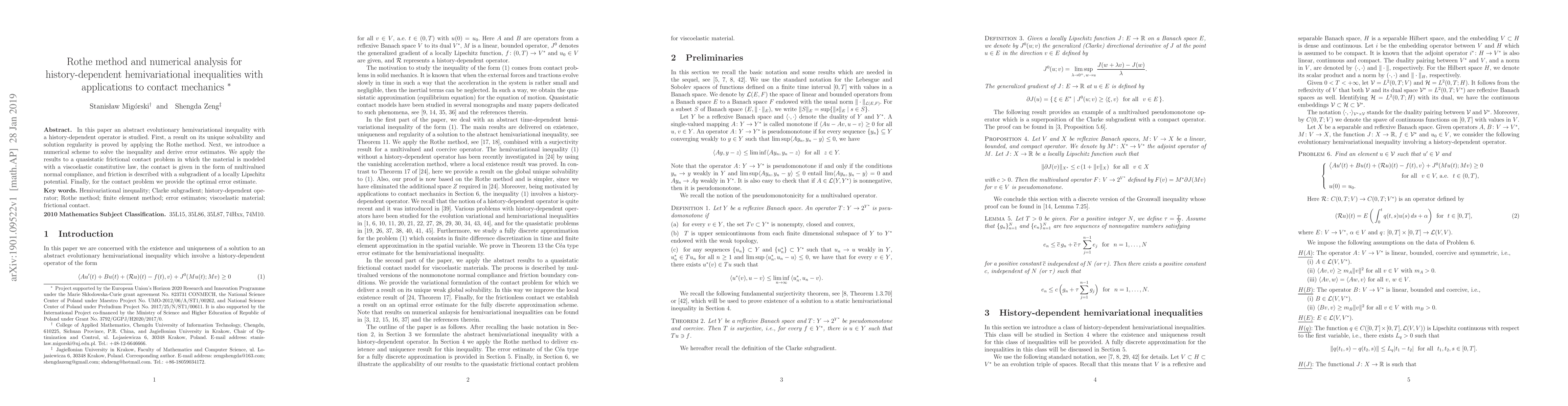 In this paper an abstract evolutionary hemivariational inequality with a history-dependent operator is studied. First, a result on its unique solvability and solution regularity is proved by applying the Rothe method. Next, we introduce a numerical scheme to solve the inequality and derive error estimates. We apply the results to a quasistatic frictional contact problem in which the material is modeled with a viscoelastic constitutive law, the contact is given in the form of multivalued normal compliance, and friction is described with a subgradient of a locally Lipschitz potential. Finally, for the contact problem we provide the optimal error estimate.