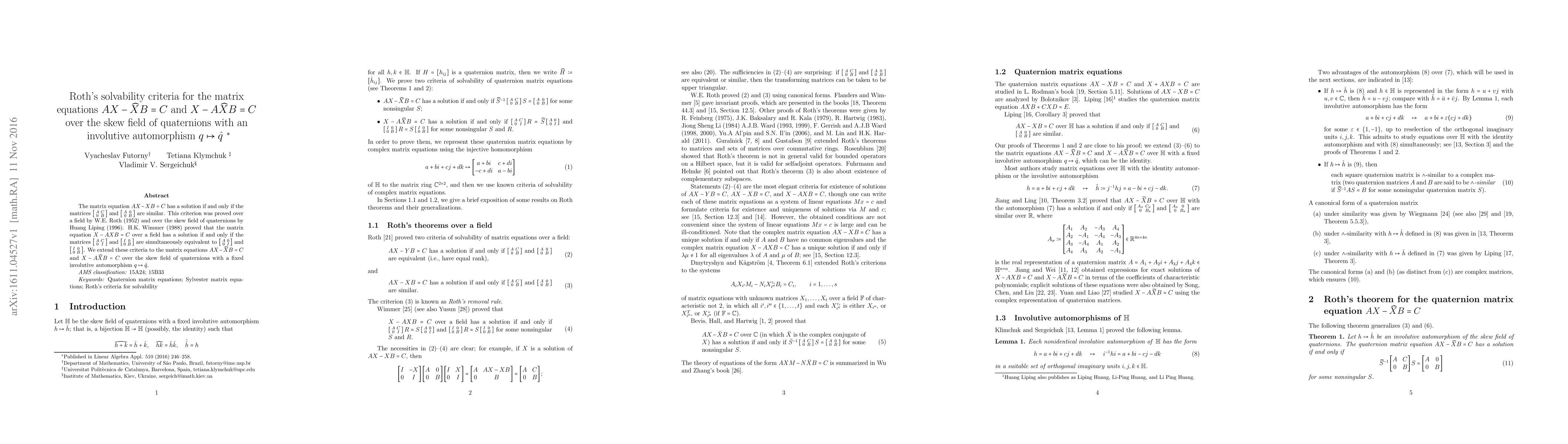 The matrix equation $AX-XB=C$ has a solution if and only if the matrices [A&C\\0&B] and [A &0\\0 & B] are similar. This criterion was proved over a field by W.E. Roth (1952) and over the skew field of quaternions by Huang Liping (1996). H.K. Wimmer (1988) obtained an analogous criterion for the matrix equation $X-AXB=C$ over a field. We extend these criteria to the matrix equations $AX-\widehat XB=C$ and $X-A\widehat XB=C$ over the skew field of quaternions with a fixed involutive automorphism $q\mapsto \hat q$.