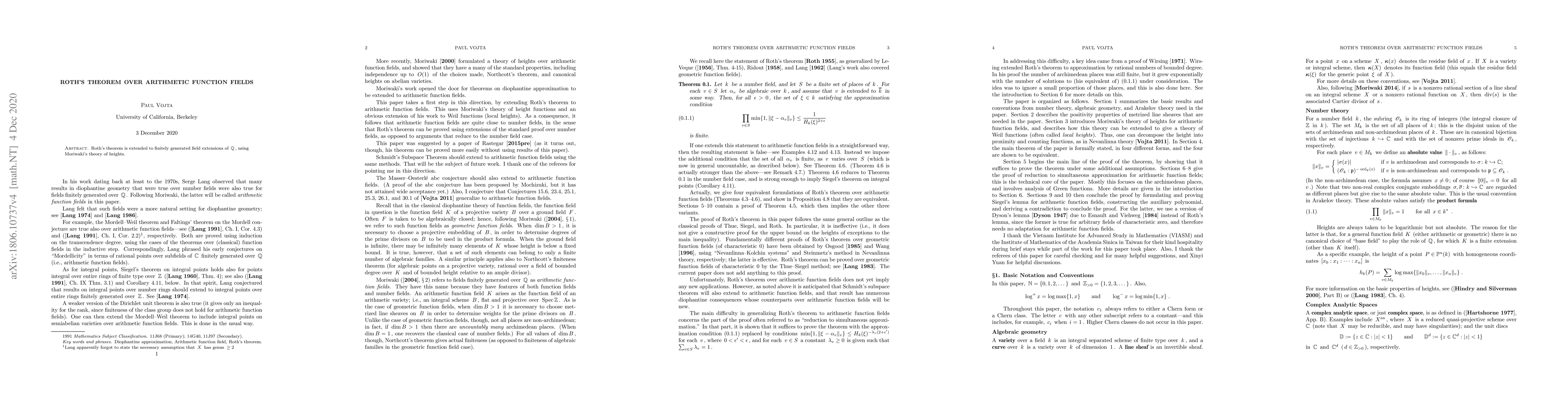 Summary: Roth's theorem, which addresses the existence of long arithmetic progressions in dense sets, is extended to finitely generated field extensions of $\mathbb{Q}$. This extension leverages Moriwaki's framework for heights to handle the complexities of arithmetic function fields.