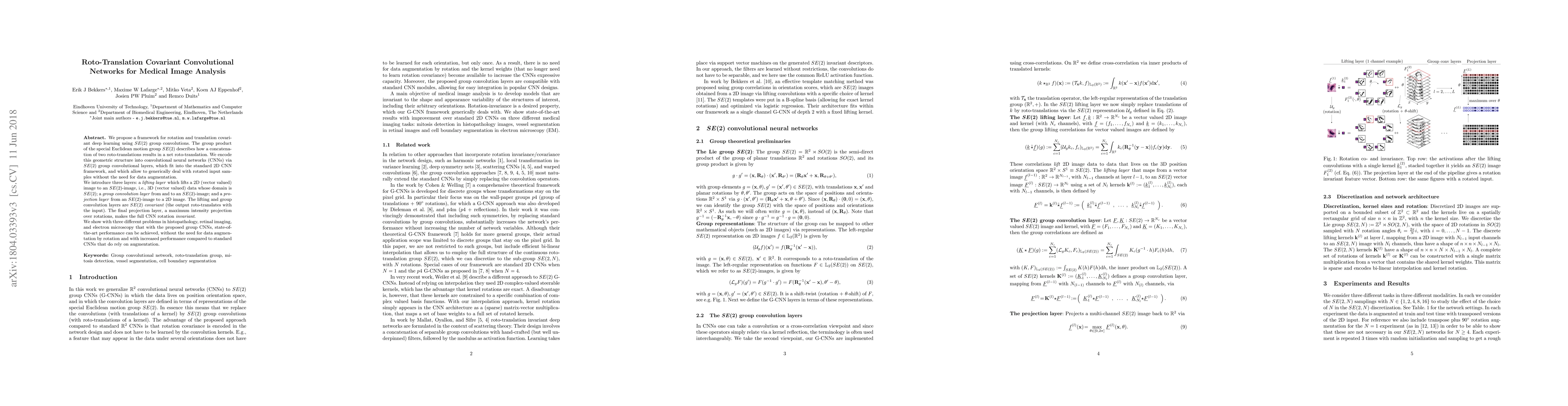 This paper proposes a framework using $SE(2)$ group convolutional networks to achieve rotation and translation covariance in medical image analysis, enabling state-of-the-art performance without data augmentation through specially designed lifting, group convolution, and projection layers.