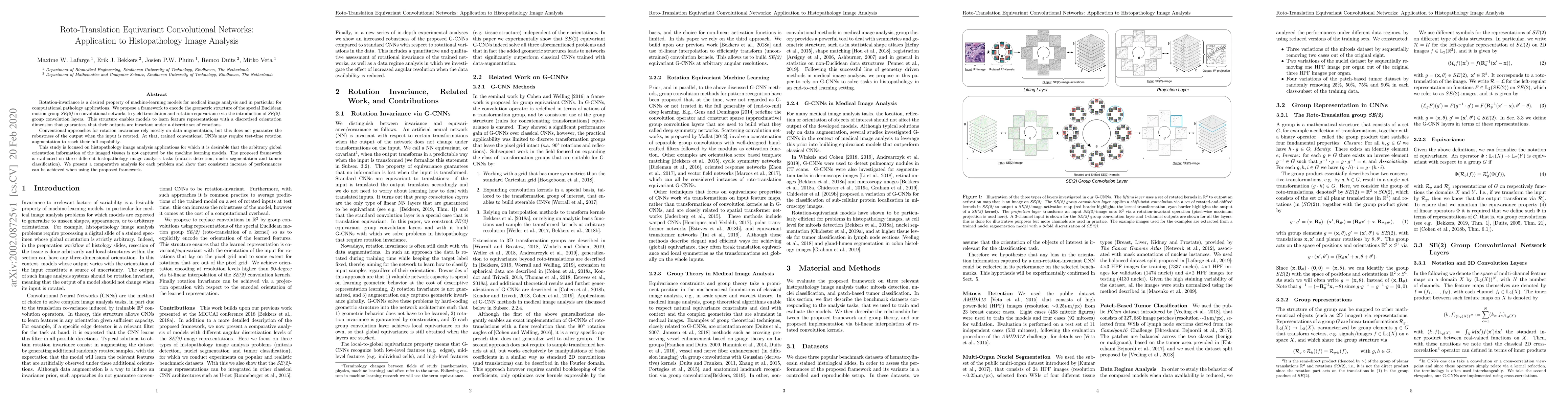 This paper proposes a framework incorporating SE(2)-group convolution layers to achieve translation and rotation equivariance in convolutional networks, enhancing robustness in histopathology image analysis. The method outperforms conventional approaches, demonstrating consistent performance gains in mitosis detection, nuclei segmentation, and tumor classification tasks.