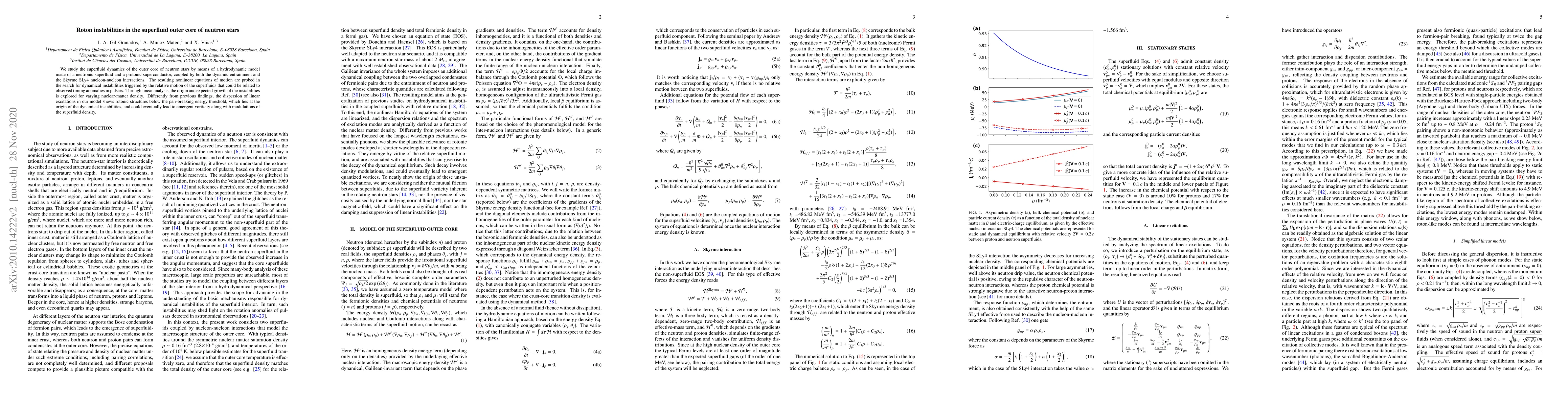 We study the superfluid dynamics of the outer core of neutron stars by means of a hydrodynamic model made of a neutronic superfluid and a protonic superconductor, coupled by both the dynamic entrainment and the Skyrme SLy4 nucleon-nucleon interactions. The resulting nonlinear equations of motion are probed in the search for dynamical instabilities triggered by the relative motion of the superfluids that could be related to observed timing anomalies in pulsars. Through linear analysis, the origin and expected growth of the instabilities is explored for varying nuclear-matter density. Differently from previous findings, the dispersion of linear excitations in our model shows rotonic structures below the pair-breaking energy threshold, which lies at the origin of the dynamical instabilities, and could eventually lead to emergent vorticity along with modulations of the superfluid density.