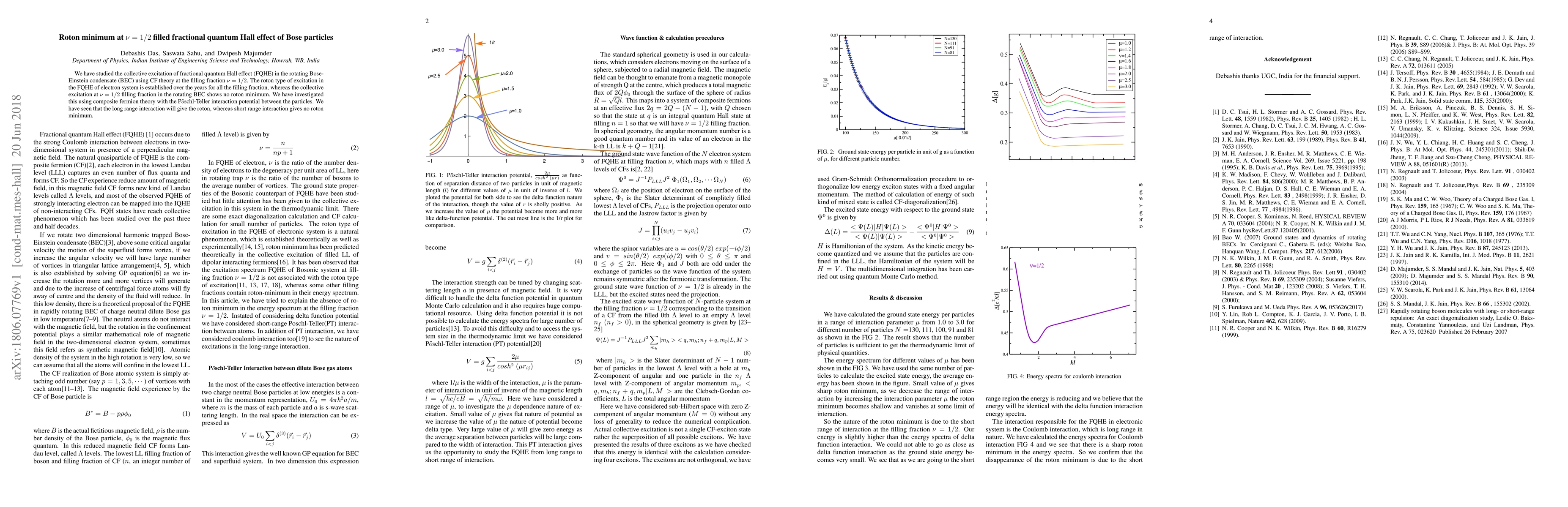 We have studied the collective excitation of fractional quantum Hall effect (FQHE) in the rotating Bose-Einstein condensate (BEC) using CF theory at the filling fraction $\nu=1/2$. The roton type of excitation in the FQHE of electron system is established over the years for all the filling fraction, whereas the collective excitation at $\nu=1/2$ filling fraction in the rotating BEC shows no roton minimum. We have investigated this using composite fermion theory with the P$\ddot{o}$schl-Teller interaction potential between the particles. We have seen that the long range interaction will give the roton, whereas short range interaction gives no roton minimum.
