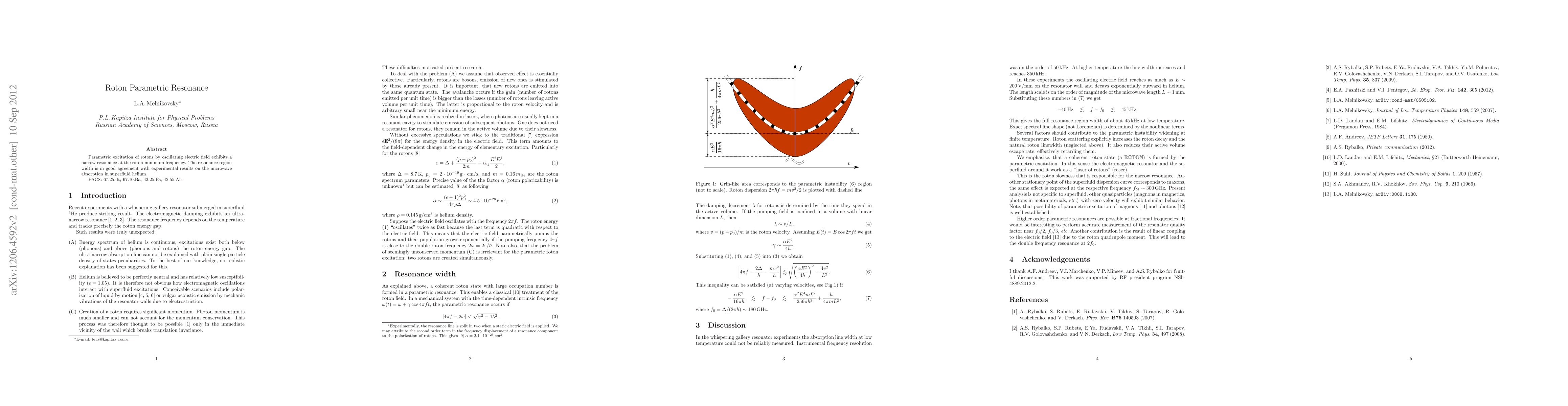 Research on roton parametric resonance shows a narrow resonance peak at the minimum frequency of rotons when excited by an oscillating electric field. This result matches experimental data for microwave absorption in superfluid helium.