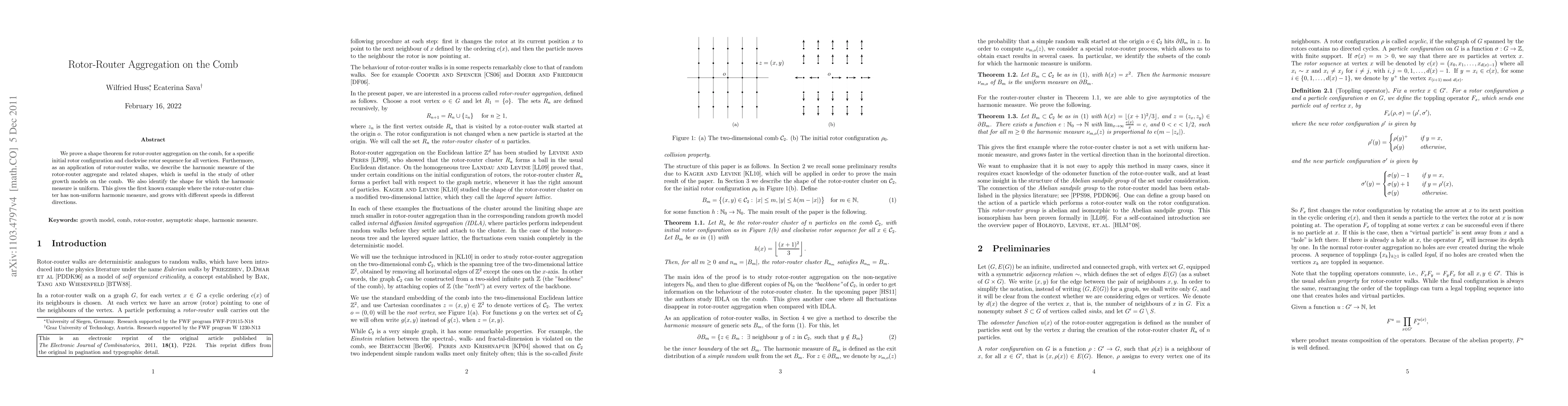 This paper proves a shape theorem for rotor-router aggregation on the comb, showing a specific initial rotor configuration leads to non-uniform harmonic measure. It identifies the shape where the harmonic measure is uniform, marking the first known example of rotor-router cluster growth with different speeds in different directions.
