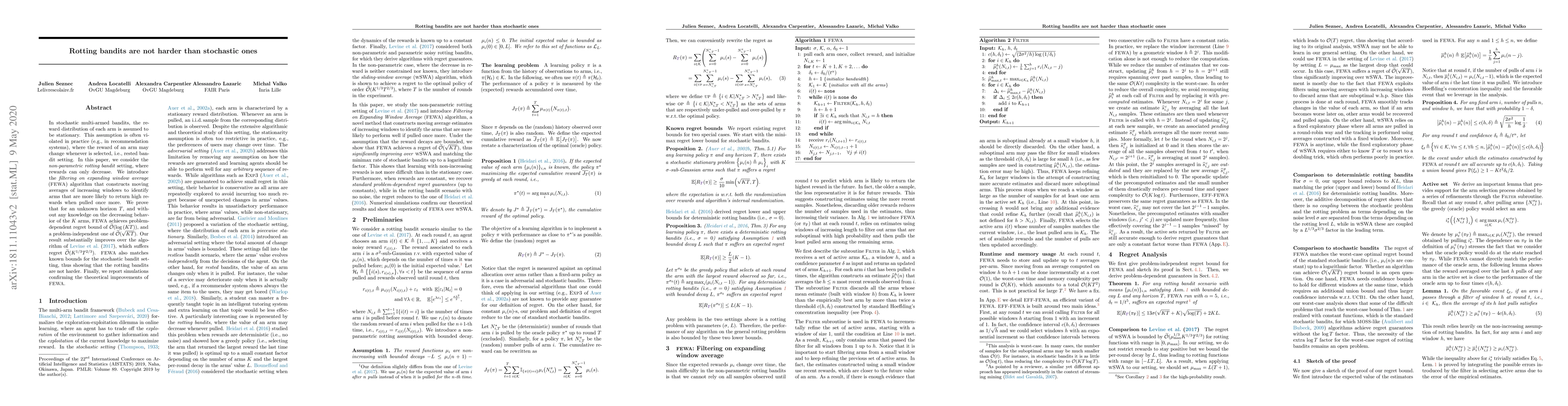 In stochastic multi-armed bandits, the reward distribution of each arm is assumed to be stationary. This assumption is often violated in practice (e.g., in recommendation systems), where the reward of an arm may change whenever is selected, i.e., rested bandit setting. In this paper, we consider the non-parametric rotting bandit setting, where rewards can only decrease. We introduce the filtering on expanding window average (FEWA) algorithm that constructs moving averages of increasing windows to identify arms that are more likely to return high rewards when pulled once more. We prove that for an unknown horizon $T$, and without any knowledge on the decreasing behavior of the $K$ arms, FEWA achieves problem-dependent regret bound of $\widetilde{\mathcal{O}}(\log{(KT)}),$ and a problem-independent one of $\widetilde{\mathcal{O}}(\sqrt{KT})$. Our result substantially improves over the algorithm of Levine et al. (2017), which suffers regret $\widetilde{\mathcal{O}}(K^{1/3}T^{2/3})$. FEWA also matches known bounds for the stochastic bandit setting, thus showing that the rotting bandits are not harder. Finally, we report simulations confirming the theoretical improvements of FEWA.