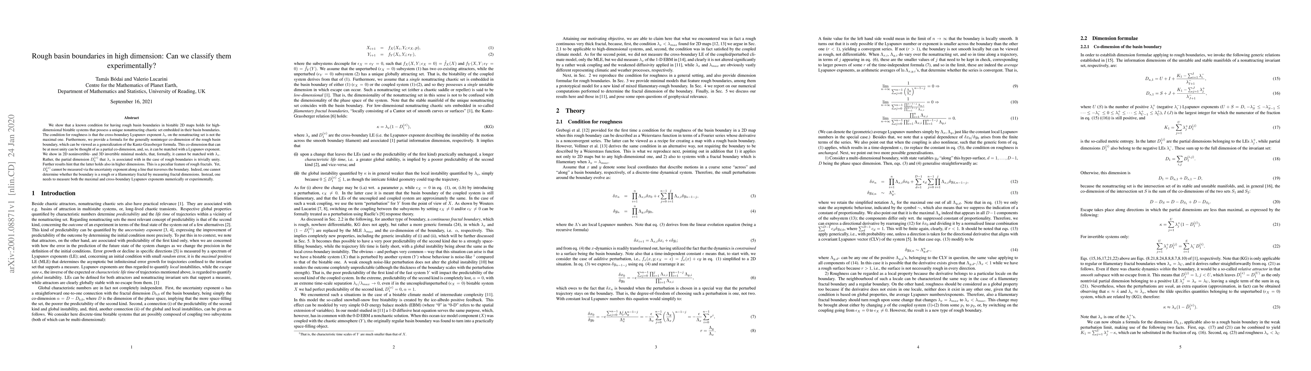 We show that a known condition for having rough basin boundaries in bistable 2D maps holds for high-dimensional bistable systems that possess a unique nonattracting chaotic set embedded in their basin boundaries. The condition for roughness is that the cross-boundary Lyapunov exponent $\lambda_x$ {\bfac on the nonattracting set} is not the maximal one. Furthermore, we provide a formula for the generally noninteger co-dimension of the rough basin boundary, which can be viewed as a generalization of the Kantz-Grassberger formula. This co-dimension that can be at most unity can be thought of as a partial co-dimension, and, so, it can be matched with a Lyapunov exponent. We show {\bfac in 2D noninvertible- and 3D invertible minimal models,} that, formally, it cannot be matched with $\lambda_x$. Rather, the partial dimension $D_0^{(x)}$ that $\lambda_x$ is associated with in the case of rough boundaries is trivially unity. Further results hint that the latter holds also in higher dimensions. This is a peculiar feature of rough fractals. Yet, $D_0^{(x)}$ cannot be measured via the uncertainty exponent along a line that traverses the boundary. Indeed, one cannot determine whether the boundary is a rough or a filamentary fractal by measuring fractal dimensions. Instead, one needs to measure both the maximal and cross-boundary Lyapunov exponents numerically or experimentally.