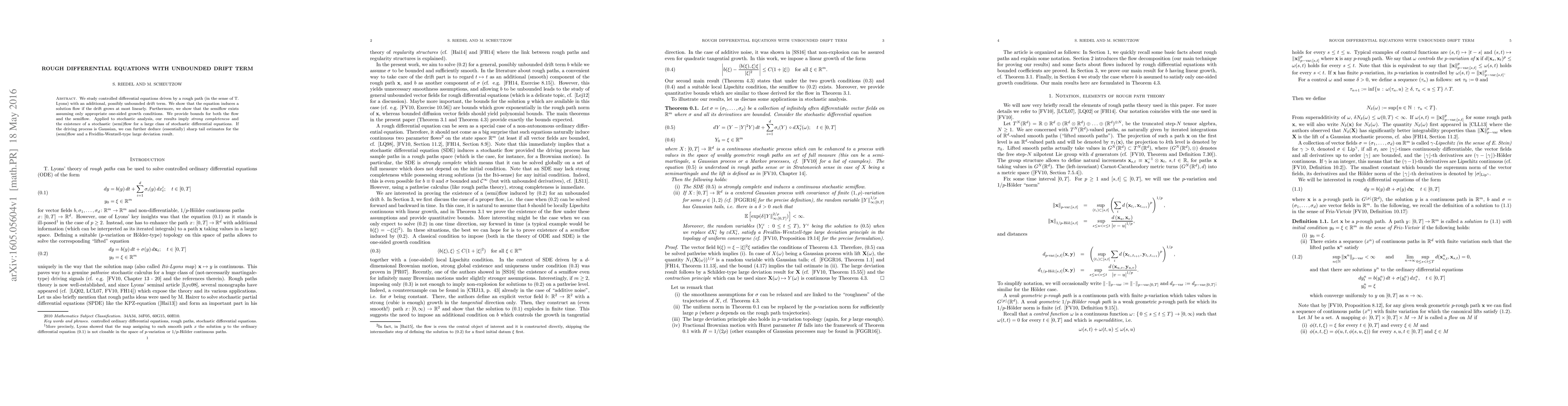 We study controlled differential equations driven by a rough path (in the sense of T. Lyons) with an additional, possibly unbounded drift term. We show that the equation induces a solution flow if the drift grows at most linearly. Furthermore, we show that the semiflow exists assuming only appropriate one-sided growth conditions. We provide bounds for both the flow and the semiflow. Applied to stochastic analysis, our results imply "strong completeness" and the existence of a stochastic (semi)flow for a large class of stochastic differential equations. If the driving process is Gaussian, we can further deduce (essentially) sharp tail estimates for the (semi)flow and a Freidlin-Wentzell-type large deviation result.