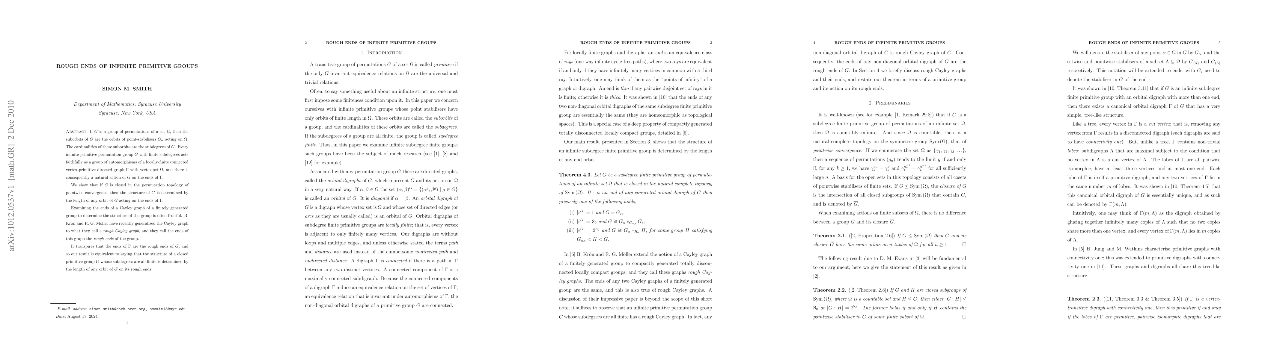 If $G$ is a group of permutations of a set $\Omega$, then the suborbits of $G$ are the orbits of point-stabilisers $G_\alpha$ acting on $\Omega$. The cardinalities of these suborbits are the subdegrees of $G$. Every infinite primitive permutation group $G$ with finite subdegrees acts faithfully as a group of automorphisms of a locally-finite connected vertex-primitive directed graph $\Gamma$ with vertex set $\Omega$, and there is consequently a natural action of $G$ on the ends of $\Gamma$. We show that if $G$ is closed in the permutation topology of pointwise convergence, then the structure of $G$ is determined by the length of any orbit of $G$ acting on the ends of $\Gamma$. Examining the ends of a Cayley graph of a finitely generated group to determine the structure of the group is often fruitful. B. Kr{\"o}n and R. G. M{\"o}ller have recently generalised the Cayley graph to what they call a {\it rough Cayley graph}, and they call the ends of this graph the {\it rough ends} of the group. It transpires that the ends of $\Gamma$ are the rough ends of $G$, and so our result is equivalent to saying that the structure of a closed primitive group $G$ whose subdegrees are all finite is determined by the length of any orbit of $G$ on its rough ends.