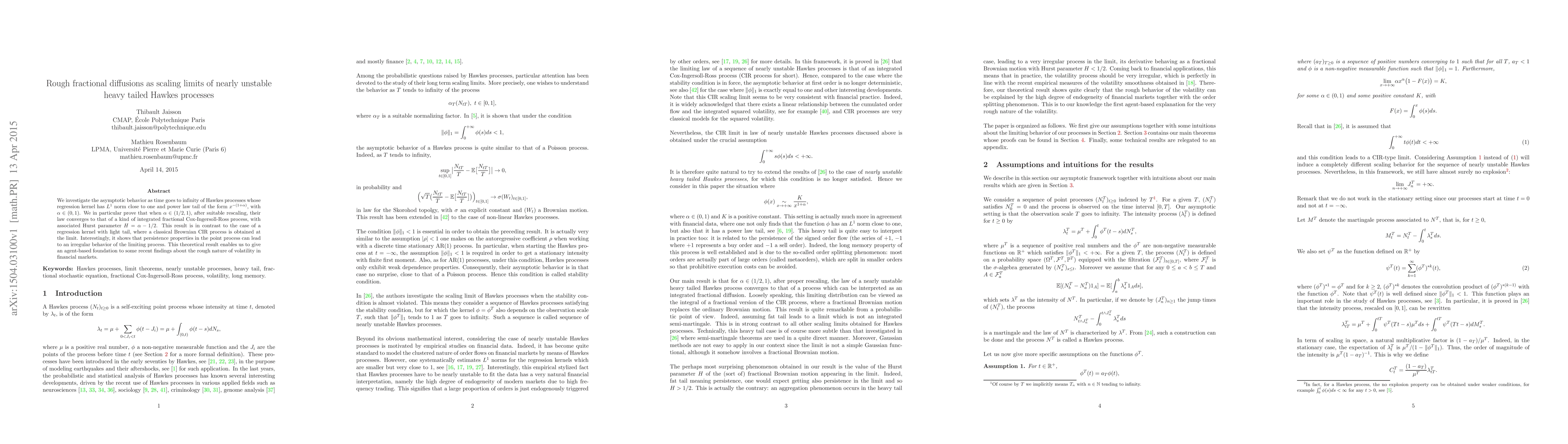This paper studies the scaling limits of nearly unstable heavy-tailed Hawkes processes, proving that for specific $\alpha$ values, they converge to rough fractional diffusions rather than classical Brownian processes. This irregular limiting behavior highlights the persistence properties of the point process.