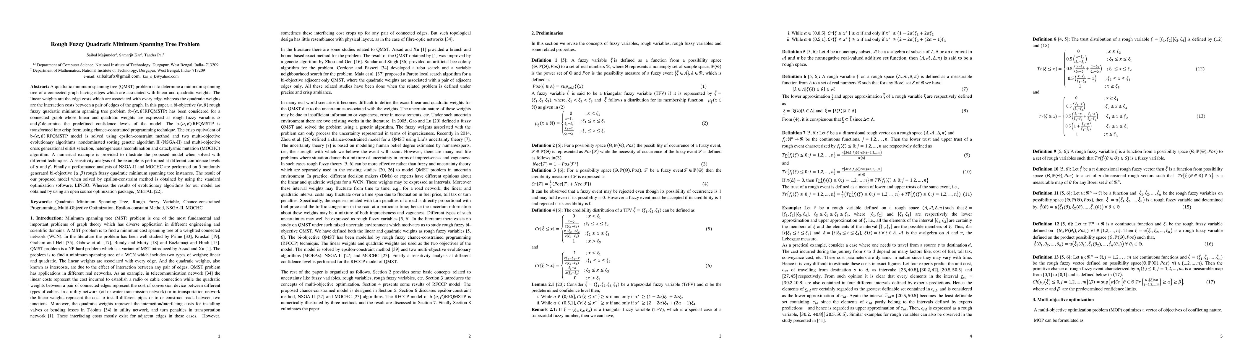 This paper explores the bi-objective rough fuzzy quadratic minimum spanning tree problem (b-({\alpha},\b{eta}) RFQMSTP), where linear and quadratic weights are rough fuzzy variables. The problem is transformed into a crisp form using chance-constrained programming and solved using epsilon-constraint method and two evolutionary algorithms, NSGA-II and MOCHC, with performance analysis on randomly generated instances.