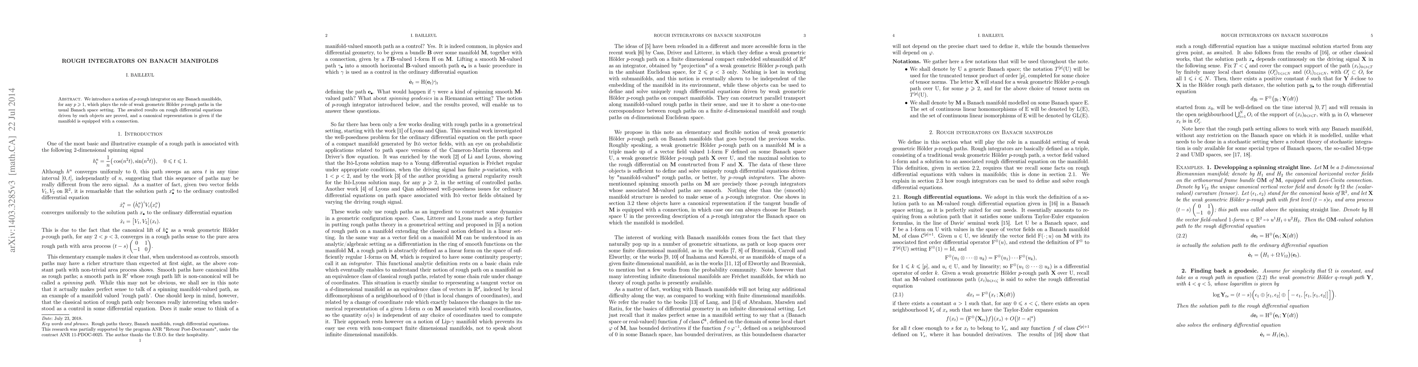 This paper introduces a concept of p-rough integrator on Banach manifolds, serving as a weak geometric Holder p-rough paths analogue. It proves results for rough differential equations driven by these integrators and provides a canonical representation when the manifold has a connection.