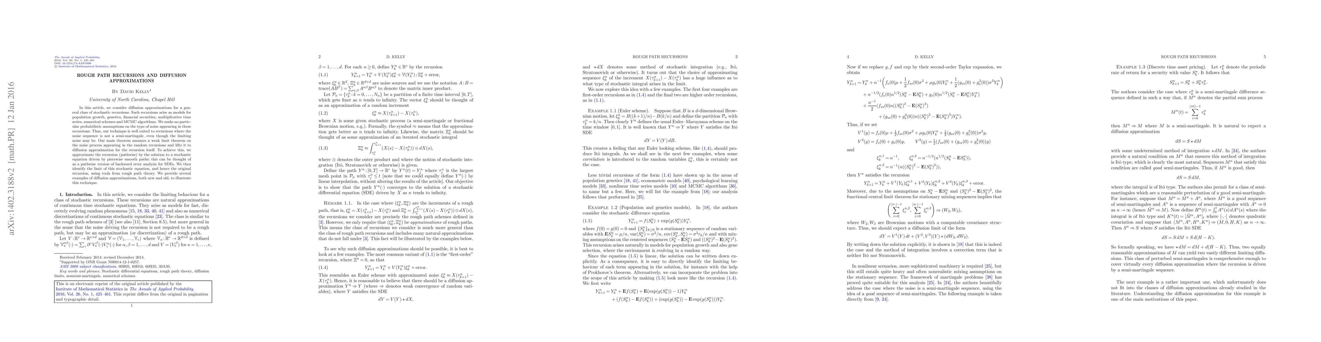 In this article, we consider diffusion approximations for a general class of stochastic recursions. Such recursions arise as models for population growth, genetics, financial securities, multiplicative time series, numerical schemes and MCMC algorithms. We make no particular probabilistic assumptions on the type of noise appearing in these recursions. Thus, our technique is well suited to recursions where the noise sequence is not a semi-martingale, even though the limiting noise may be. Our main theorem assumes a weak limit theorem on the noise process appearing in the random recursions and lifts it to diffusion approximation for the recursion itself. To achieve this, we approximate the recursion (pathwise) by the solution to a stochastic equation driven by piecewise smooth paths; this can be thought of as a pathwise version of backward error analysis for SDEs. We then identify the limit of this stochastic equation, and hence the original recursion, using tools from rough path theory. We provide several examples of diffusion approximations, both new and old, to illustrate this technique.