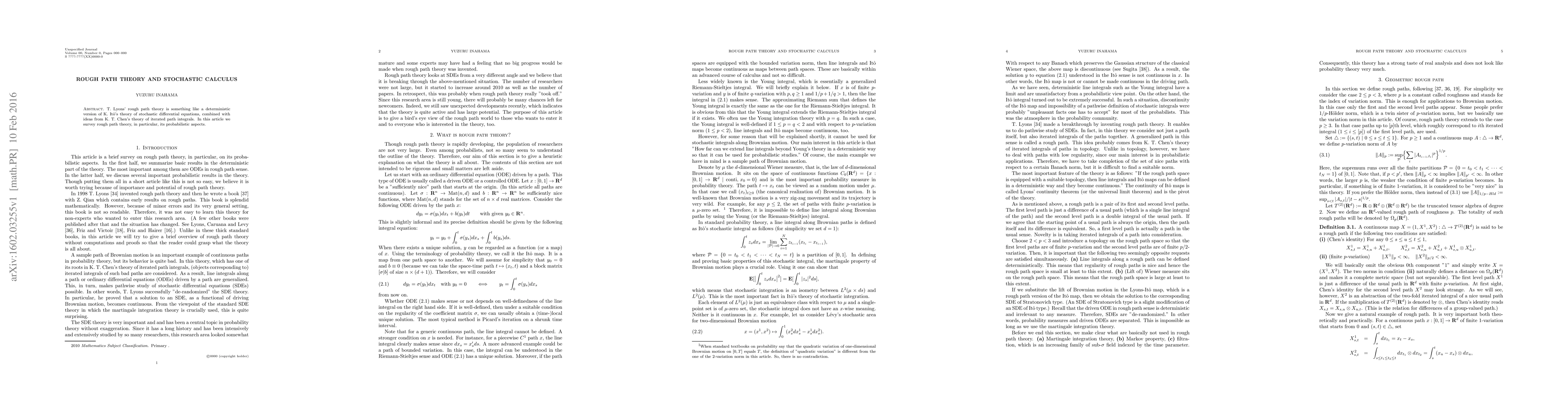 Summary: This paper surveys T. Lyons' rough path theory, which integrates deterministic aspects of stochastic calculus with K. T. Chen's iterated path integrals, offering a novel probabilistic framework for understanding stochastic differential equations.