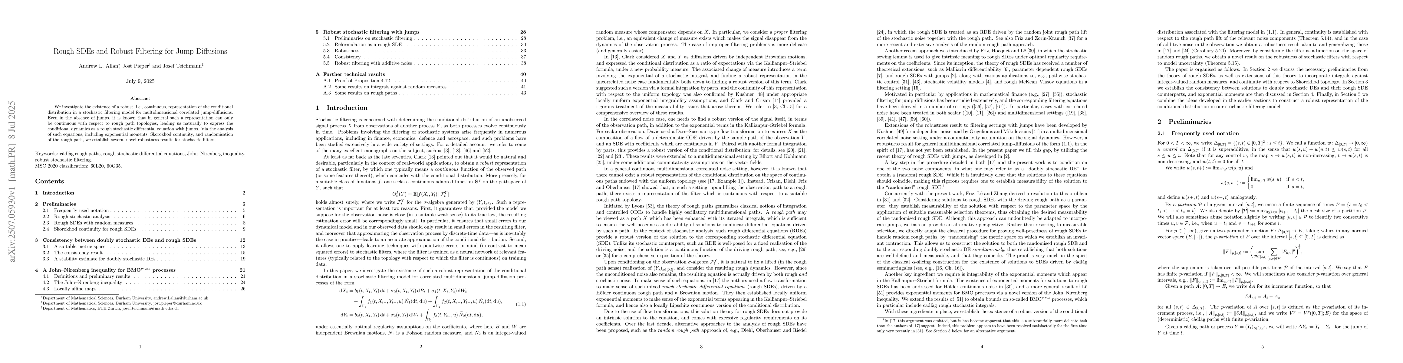 We investigate the existence of a robust, i.e., continuous, representation of the conditional distribution in a stochastic filtering model for multidimensional correlated jump-diffusions. Even in the absence of jumps, it is known that in general such a representation can only be continuous with respect to rough path topologies, leading us naturally to express the conditional dynamics as a rough stochastic differential equation with jumps. Via the analysis of such equations, including exponential moments, Skorokhod continuity, and randomisation of the rough path, we establish several novel robustness results for stochastic filters.