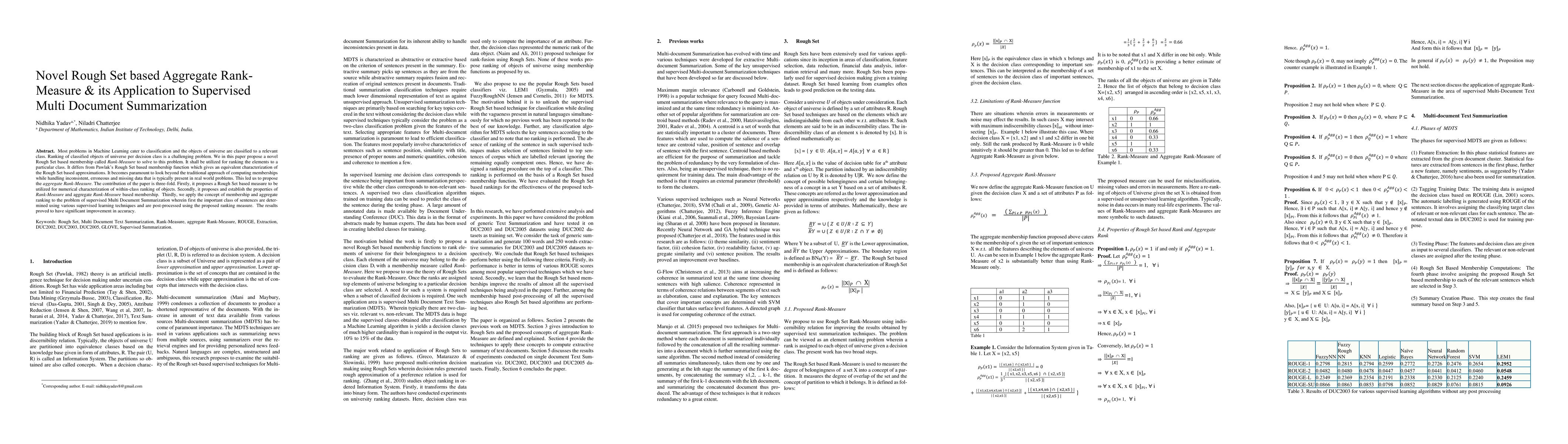 This paper proposes a new method to rank objects within a class using a Rough Set based aggregate measure, which improves accuracy in supervised multi-document summarization.