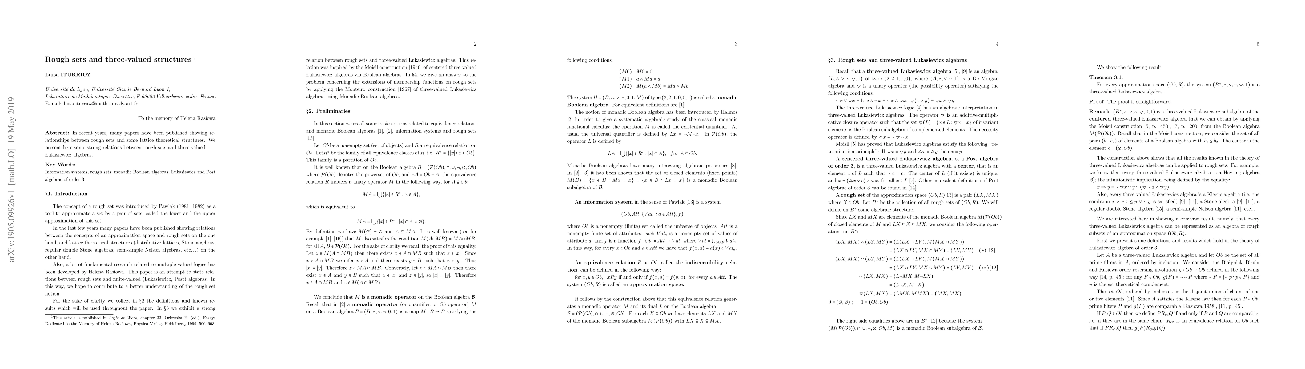 Summary: This paper explores the strong connections between rough sets and three-valued {\L}ukasiewicz algebras, highlighting their interrelations within lattice theoretical frameworks. The study aims to deepen the understanding of these relationships in the context of knowledge representation and uncertainty management.