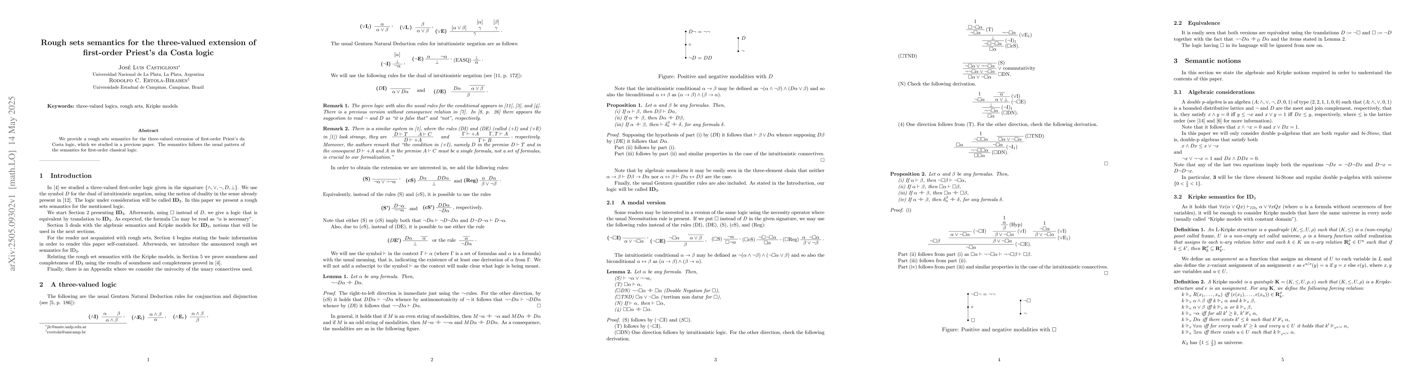 The introduction of rough sets semantics for the three-valued extension of first-order Priest's da Costa logic.