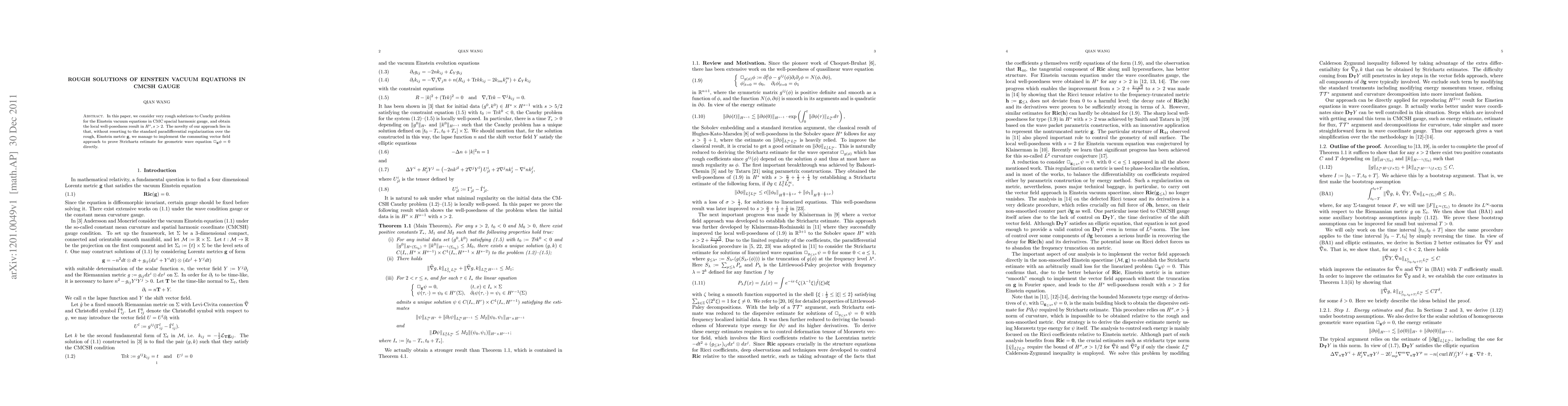 In this paper, we consider very rough solutions to Cauchy problem for the Einstein vacuum equations in CMC spacial harmonic gauge, and obtain the local well-posedness result in $H^s, s>2$. The novelty of our approach lies in that, without resorting to the standard paradifferential regularization over the rough, Einstein metric $\bg$, we manage to implement the commuting vector field approach to prove Strichartz estimate for geometric wave equation $\Box_\bg \phi=0$ directly.