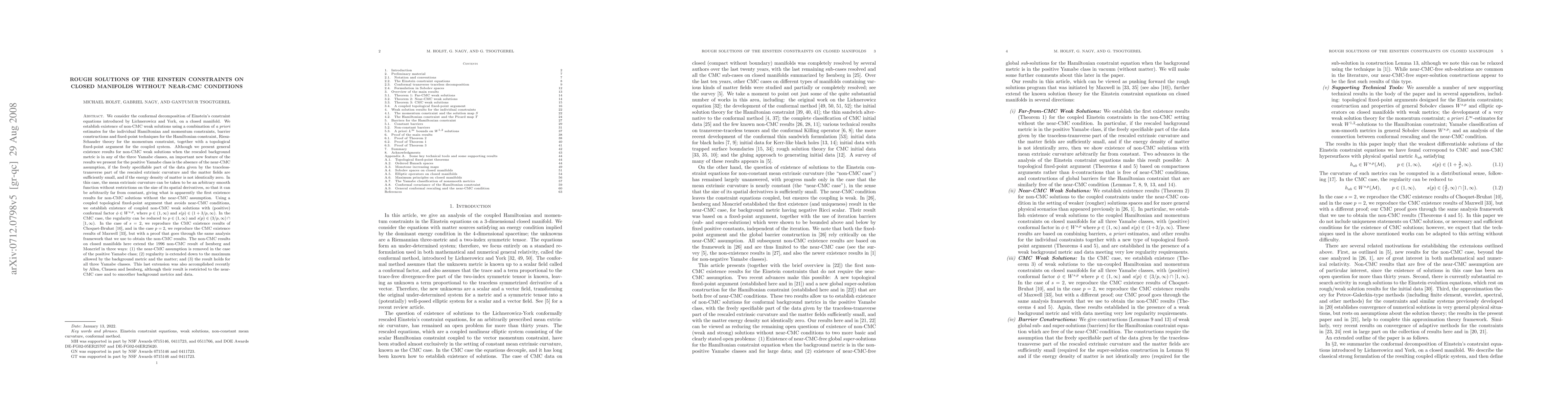 We consider the conformal decomposition of Einstein's constraint equations introduced by Lichnerowicz and York, on a closed manifold. We establish existence of non-CMC weak solutions using a combination of a priori estimates for the individual Hamiltonian and momentum constraints, barrier constructions for the Hamiltonian constraint, and topological fixed-point arguments. An important new feature of these results is the absense of the near-CMC assumption when the rescaled background metric is in the positive Yamabe class, if the freely specifiable part of the data given by the matter fields (if present) and the traceless-transverse part of the rescaled extrinsic curvature are taken to be sufficiently small. In this case, the mean extrinsic curvature can be taken to be an arbitrary smooth function without restrictions on the size of its spatial derivatives, giving what are apparently the first non-CMC existence results without the near-CMC assumption. Standard bootstrapping arguments to increase the regularity of the conformal factor are blocked by the use of a weak background metric. In the CMC case, we recover Maxwell's rough solution results as a special case. Our results extend the 1996 non-CMC result of Isenberg and Moncrief in three ways: (1) the near-CMC assumption is removed in the case of the positive Yamabe class; (2) regularity is extended down to the maximum allowed by the background metric and the matter; and (3) the result holds for all three Yamabe classes. This last extension was also accomplished recently by Allen, Clausen and Isenberg, although their result is restricted to the near-CMC case and to smoother background metrics and data.