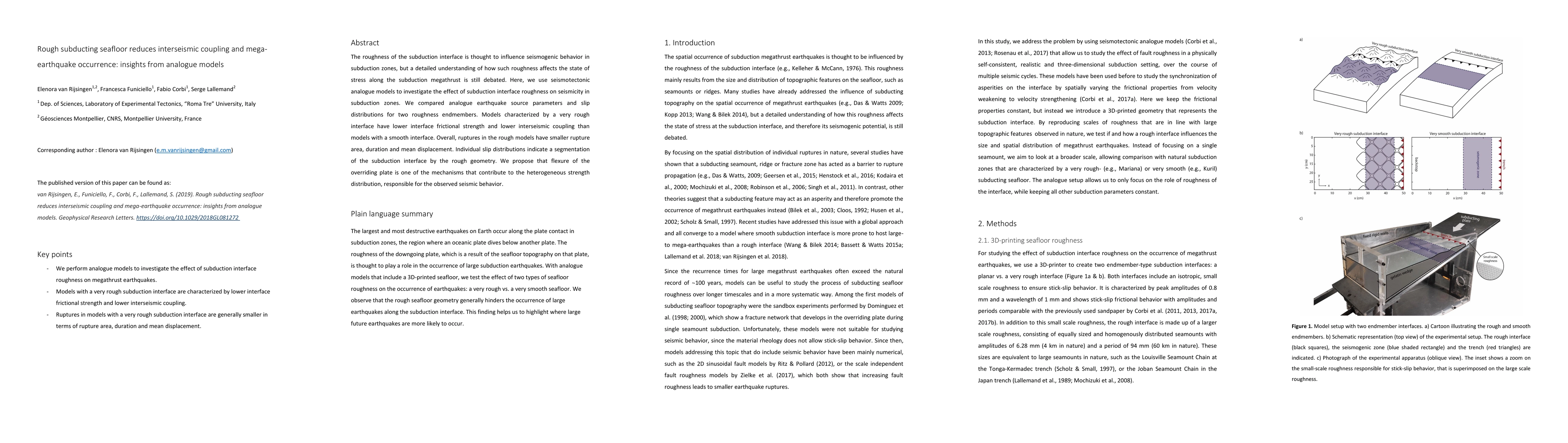 This study uses seismotectonic analogue models to explore how subduction interface roughness affects seismicity, finding that rough interfaces reduce interseismic coupling and lead to smaller, less frequent mega-earthquakes, suggesting flexure of the overriding plate contributes to this behavior.