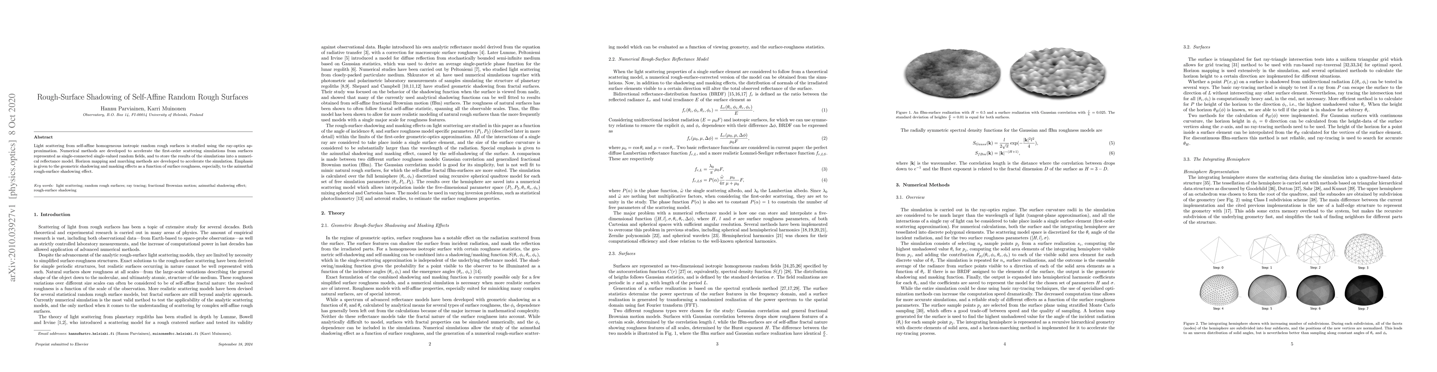 Light scattering from self-affine homogeneous isotropic random rough surfaces is studied using the ray-optics approximation. Numerical methods are developed to accelerate the first-order scattering simulations from surfaces represented as single-connected single-valued random fields, and to store the results of the simulations into a numerical reflectance model. Horizon mapping and marching methods are developed to accelerate the simulation. Emphasis is given to the geometric shadowing and masking effects as a function of surface roughness, especially, to the azimuthal rough-surface shadowing effect.