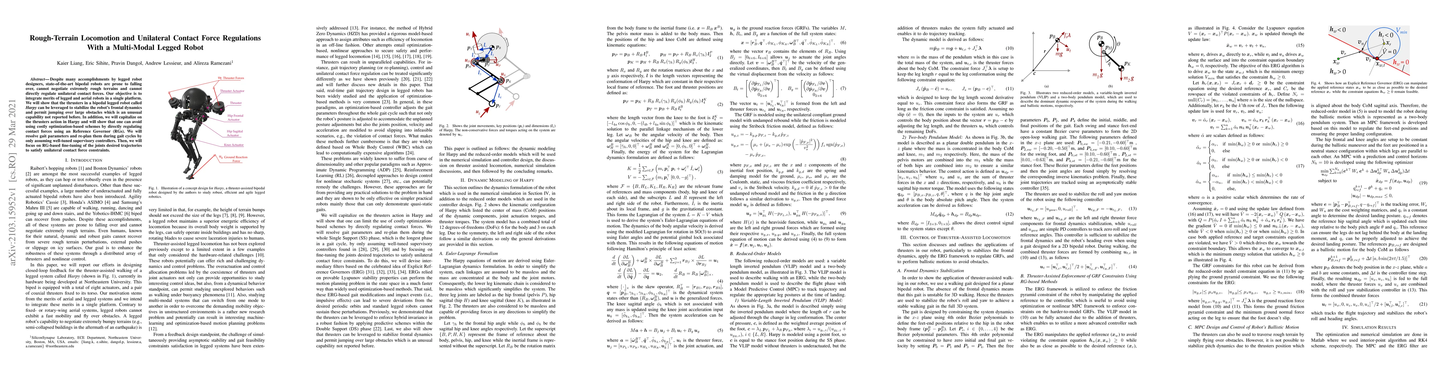 Despite many accomplishments by legged robot designers, state-of-the-art bipedal robots are prone to falling over, cannot negotiate extremely rough terrains and cannot directly regulate unilateral contact forces. Our objective is to integrate merits of legged and aerial robots in a single platform. We will show that the thrusters in a bipedal legged robot called Harpy can be leveraged to stabilize the robot's frontal dynamics and permit jumping over large obstacles which is an unusual capability not reported before. In addition, we will capitalize on the thrusters action in Harpy and will show that one can avoid using costly optimization-based schemes by directly regulating contact forces using an Reference Governor (RGs). We will resolve gait parameters and re-plan them during gait cycles by only assuming well-tuned supervisory controllers. Then, we will focus on RG-based fine-tuning of the joints desired trajectories to satisfy unilateral contact force constraints.