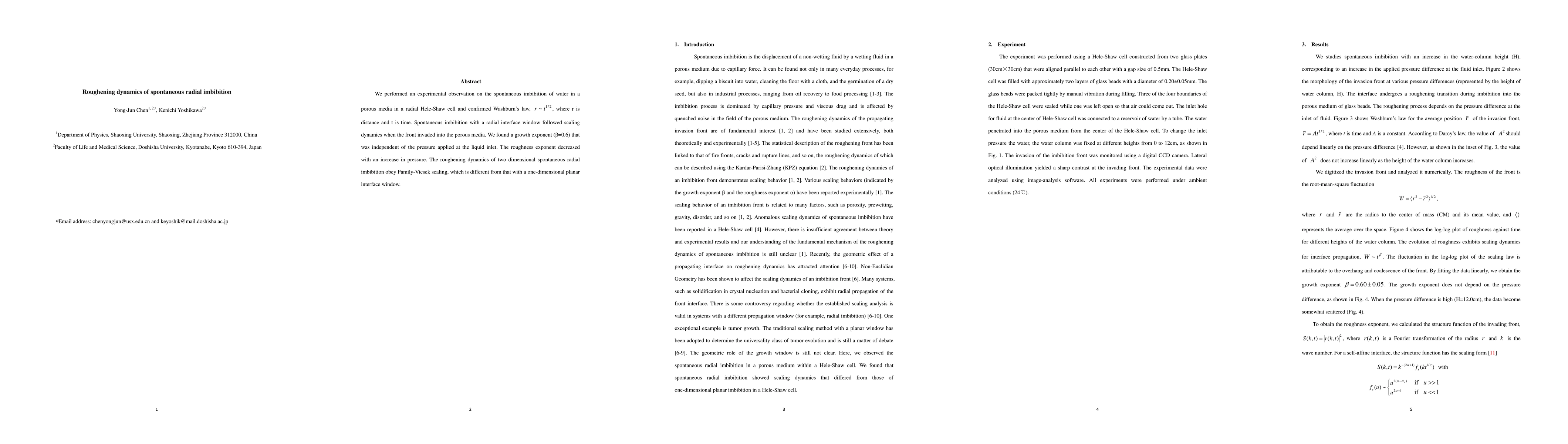 This study experimentally investigates spontaneous radial imbibition of water in porous media, confirming Washburn's law and identifying a growth exponent of 0.6. The roughening dynamics follow Family-Vicsek scaling, differing from one-dimensional planar interfaces, with roughness decreasing under higher pressure.