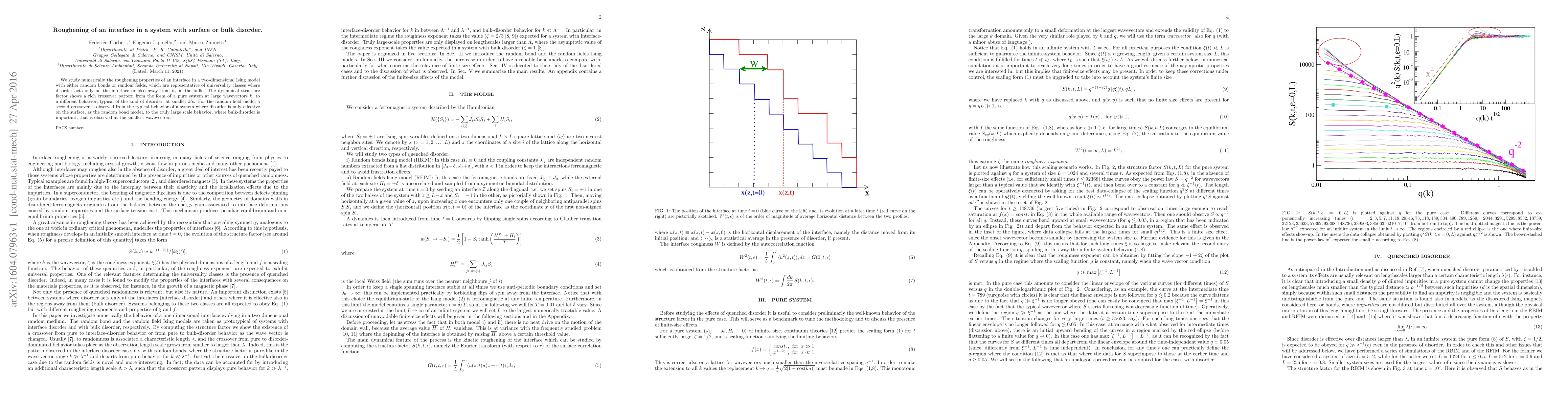 This research numerically studies how random bonds or fields in a two-dimensional Ising model affect interface roughening, revealing crossover patterns in the dynamical structure factor. It distinguishes between surface disorder and bulk disorder, showing distinct behaviors at various wavevector scales.