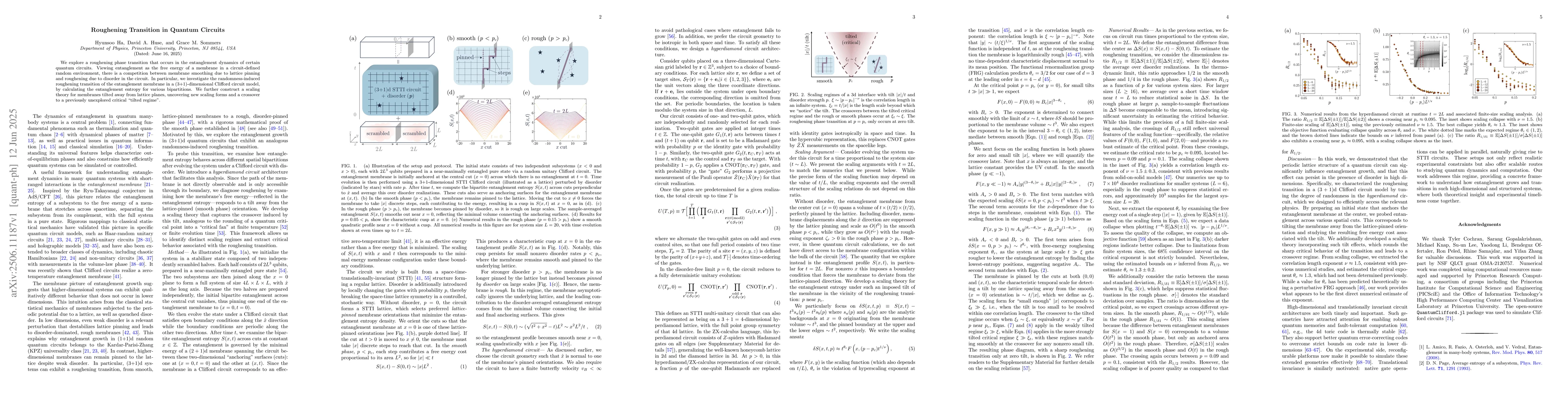 We explore a roughening phase transition that occurs in the entanglement dynamics of certain quantum circuits. Viewing entanglement as the free energy of a membrane in a circuit-defined random environment, there is a competition between membrane smoothing due to lattice pinning and roughening due to disorder in the circuit. In particular, we investigate the randomness-induced roughening transition of the entanglement membrane in a (3+1)-dimensional Clifford circuit model, by calculating the entanglement entropy for various bipartitions. We further construct a scaling theory for membranes tilted away from lattice planes, uncovering new scaling forms and a crossover to a previously unexplored critical "tilted regime".