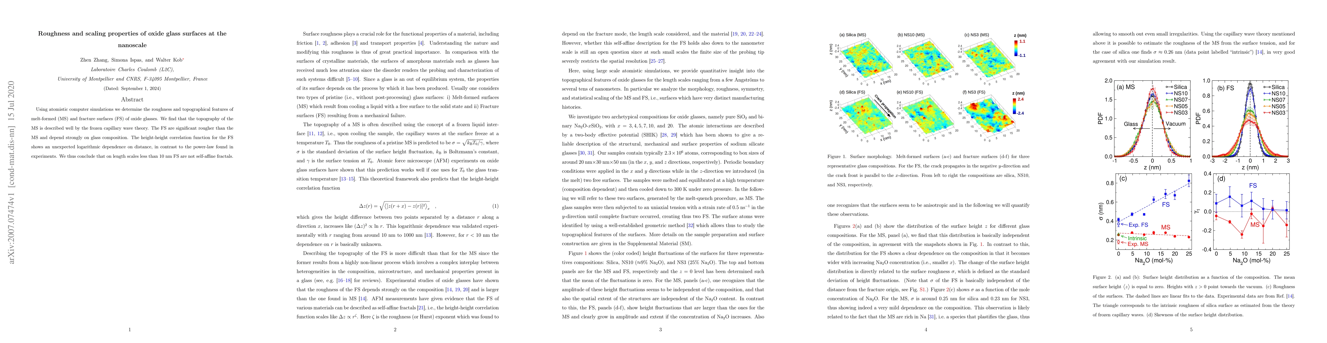 This study uses atomistic simulations to analyze the roughness and topography of melt-formed and fracture surfaces of oxide glasses. Melt-formed surfaces align with frozen capillary wave theory, while fracture surfaces are significantly rougher and composition-dependent, showing a logarithmic height-height correlation function instead of the expected power-law, indicating they are not self-affine fractals on nanoscales.
