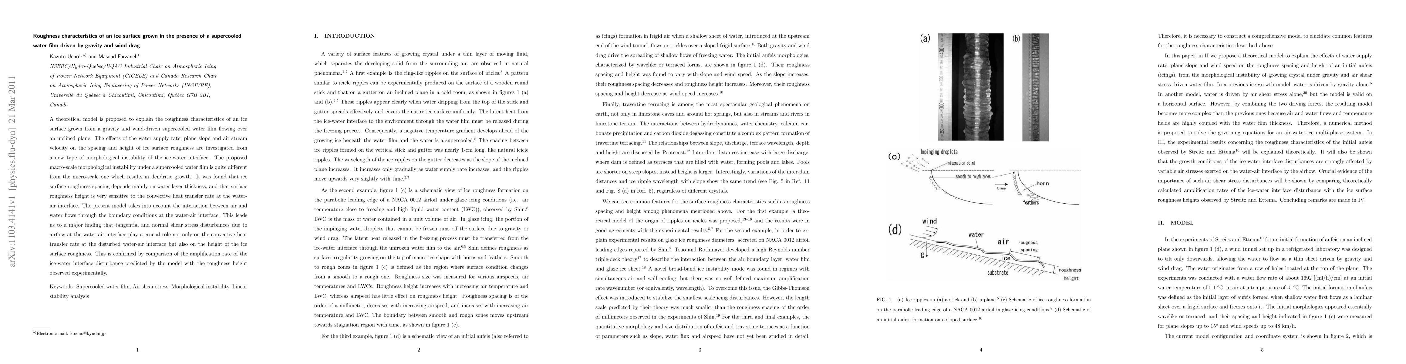 This paper proposes a theoretical model to explain the roughness characteristics of ice surfaces formed from supercooled water films driven by gravity and wind on an inclined plane. The model highlights the significant role of tangential and normal shear stress disturbances from airflow in determining both the convective heat transfer rate and the height of the ice surface roughness.
