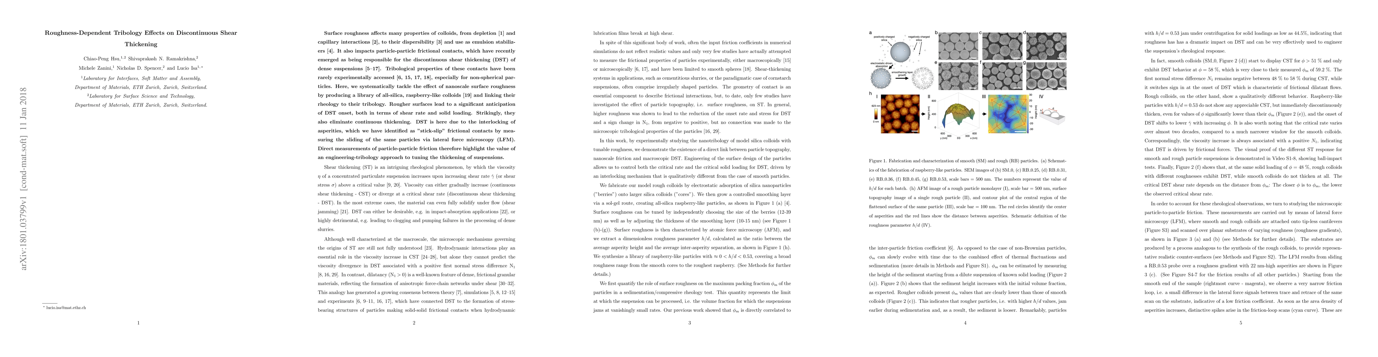 Surface roughness affects many properties of colloids, from depletion [1] and capillary interactions [2], to their dispersibility [3] and use as emulsion stabilizers [4]. It also impacts particle-particle frictional contacts, which have recently emerged as being responsible for the discontinuous shear thickening (DST) of dense suspensions [5-17]. Tribological properties of these contacts have been rarely experimentally accessed [6, 15, 17, 18], especially for non-spherical particles. Here, we systematically tackle the effect of nanoscale surface roughness by producing a library of all-silica, raspberry-like colloids [19] and linking their rheology to their tribology. Rougher surfaces lead to a significant anticipation of DST onset, both in terms of shear rate and solid loading. Strikingly, they also eliminate continuous thickening. DST is here due to the interlocking of asperities, which we have identified as "stick-slip" frictional contacts by measuring the sliding of the same particles via lateral force microscopy (LFM). Direct measurements of particle-particle friction therefore highlight the value of an engineering-tribology approach to tuning the thickening of suspensions.