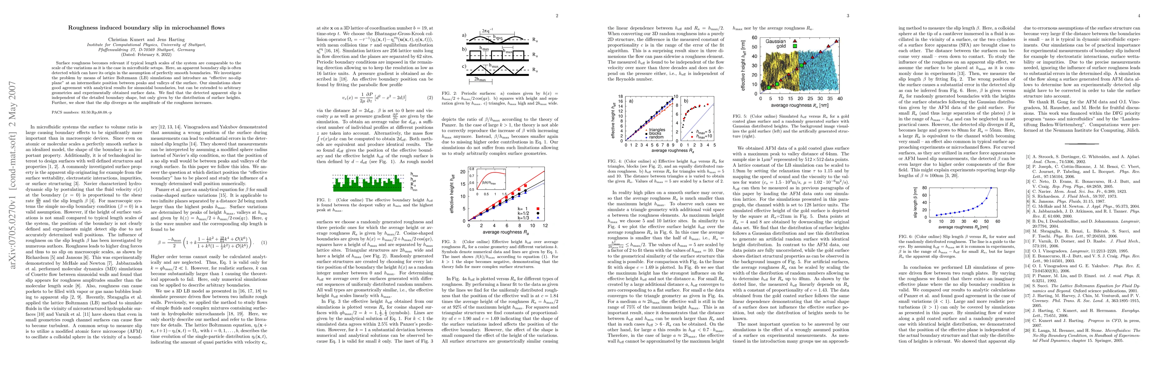 This research uses lattice Boltzmann simulations to study how surface roughness in microchannels affects fluid flow, finding that apparent boundary slip is determined by surface height distribution rather than shape, and increases with roughness amplitude.