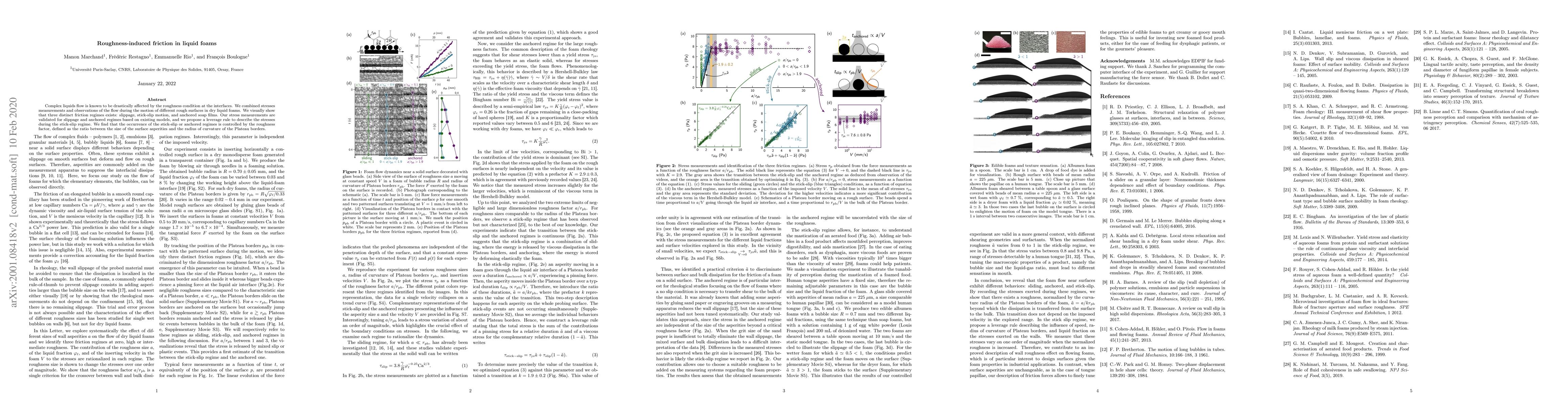Complex liquids flow is known to be drastically affected by the roughness condition at the interfaces. We combined stresses measurements and observations of the flow during the motion of different rough surfaces in dry liquid foams. We visually show that three distinct friction regimes exists: slippage, stick-slip motion, and anchored soap films. Our stress measurements are validated for slippage and anchored regimes based on existing models, and we propose a leverage rule to describe the stresses during the stick-slip regime. We find that the occurrence of the stick-slip or anchored regimes is controlled by the roughness factor, defined as the ratio between the size of the surface asperities and the radius of curvature of the Plateau borders.