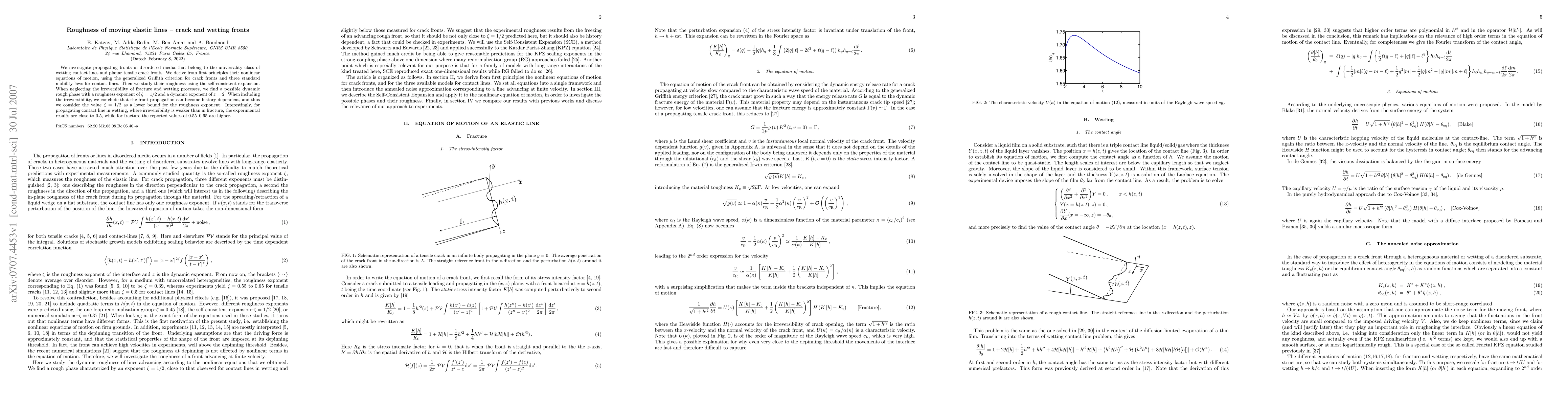 This paper derives the nonlinear equations governing the motion of wetting fronts and crack fronts in disordered media, and analyzes their roughness using self-consistent expansion. It finds a dynamic rough phase with a roughness exponent of $\zeta=1/2$ when irreversibility is neglected, but suggests $\zeta=1/2$ as a lower bound when irreversibility is included, with experimental values for wetting and fracture fronts differing accordingly.