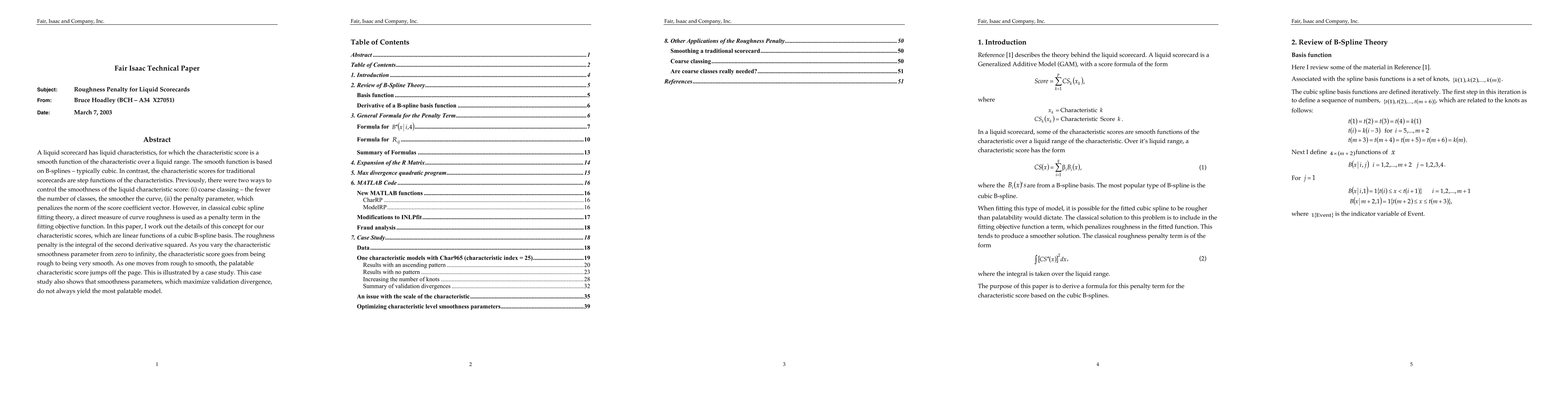 This work introduces a novel way to manage smoothness in liquid scorecards by directly incorporating a roughness penalty in the fitting objective function, distinguishing it from previous methods relying solely on class coarsening or penalty parameters.
