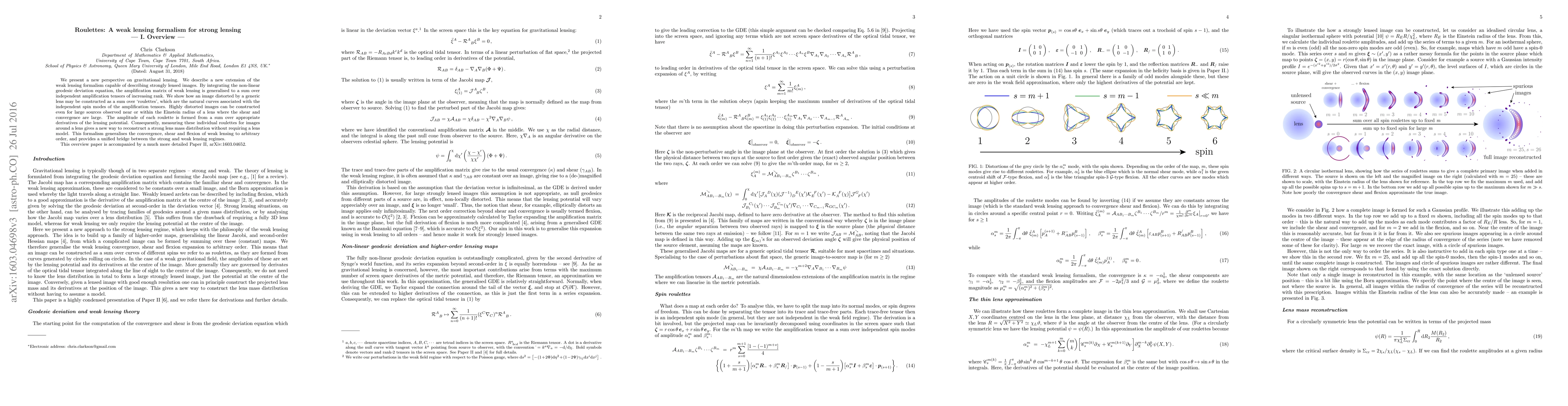 We present a new perspective on gravitational lensing. We describe a new extension of the weak lensing formalism capable of describing strongly lensed images. By integrating the non-linear geodesic deviation equation, the amplification matrix of weak lensing is generalised to a sum over independent amplification tensors of increasing rank. We show how an image distorted by a generic lens may be constructed as a sum over `roulettes', which are the natural curves associated with the independent spin modes of the amplification tensors. Highly distorted images can be constructed even for large sources observed near or within the Einstein radius of a lens where the shear and convergence are large. The amplitude of each roulette is formed from a sum over appropriate derivatives of the lensing potential. Consequently, measuring these individual roulettes for images around a lens gives a new way to reconstruct a strong lens mass distribution without requiring a lens model. This formalism generalises the convergence, shear and flexion of weak lensing to arbitrary order, and provides a unified bridge between the strong and weak lensing regimes. This overview paper is accompanied by a much more detailed Paper II, arXiv:1603.04652