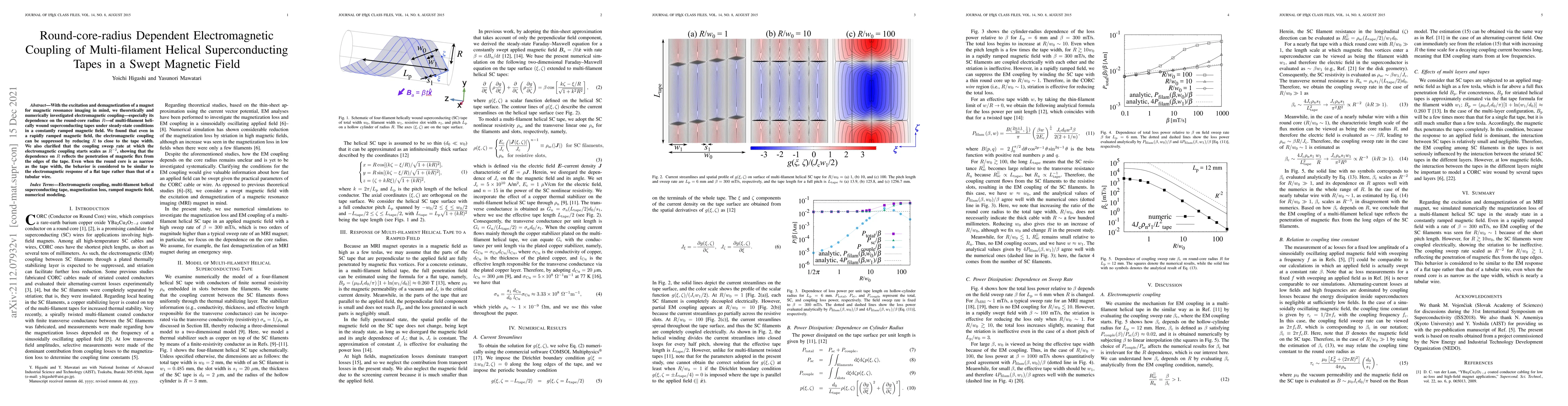 This paper investigates electromagnetic coupling in multifilament helical superconducting tapes under varying magnetic fields, finding that reducing the round core radius $R$ to near the tape width suppresses coupling. The coupling sweep rate scales as $R^{-2}$, indicating edge-driven magnetic flux penetration.