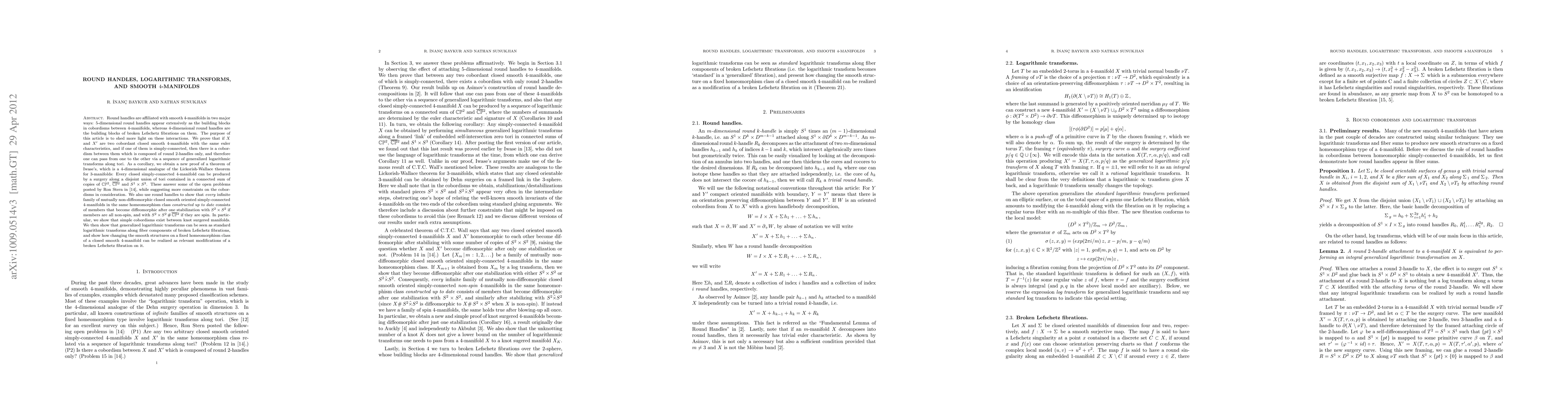 Round handles are affiliated with smooth 4-manifolds in two major ways: 5-dimensional round handles appear extensively as the building blocks in cobordisms between 4-manifolds, whereas 4-dimensional round handles are the building blocks of broken Lefschetz fibrations on them. The purpose of this article is to shed more light on these interactions. We prove that if X and X' are cobordant closed smooth 4-manifolds with the same euler characteristics, and if one of them is simply-connected, then there is a cobordism between them which is composed of round 2-handles only, and therefore one can pass from one to the other via a sequence of generalized logarithmic transforms along tori. As a corollary, we obtain a new proof of a theorem of Iwase's, which is a 4-dimensional analogue of the Lickorish-Wallace theorem for 3-manifolds: Every closed simply-connected 4-manifold can be produced by a surgery along a disjoint union of tori contained in a connected sum of copies of CP^2, -CP^2 and S^1 x S^3. These answer some of the open problems posted by Ron Stern, while suggesting more constraints on the cobordisms in consideration. We also use round handles to show that every infinite family of mutually non-diffeomorphic closed smooth oriented simply-connected 4-manifolds in the same homeomorphism class constructed up to date consists of members that become diffeomorphic after one stabilization with S^2 x S^2 if members are all non-spin, and with S^2 x S^2 # -CP^2 if they are spin. In particular, we show that simple cobordisms exist between knot surgered manifolds. We then show that generalized logarithmic transforms can be seen as standard logarithmic transforms along fiber components of broken Lefschetz fibrations, and show how changing the smooth structures on a fixed homeomorphism class of a closed smooth 4-manifold can be realized as relevant modifications of a broken Lefschetz fibration on it.