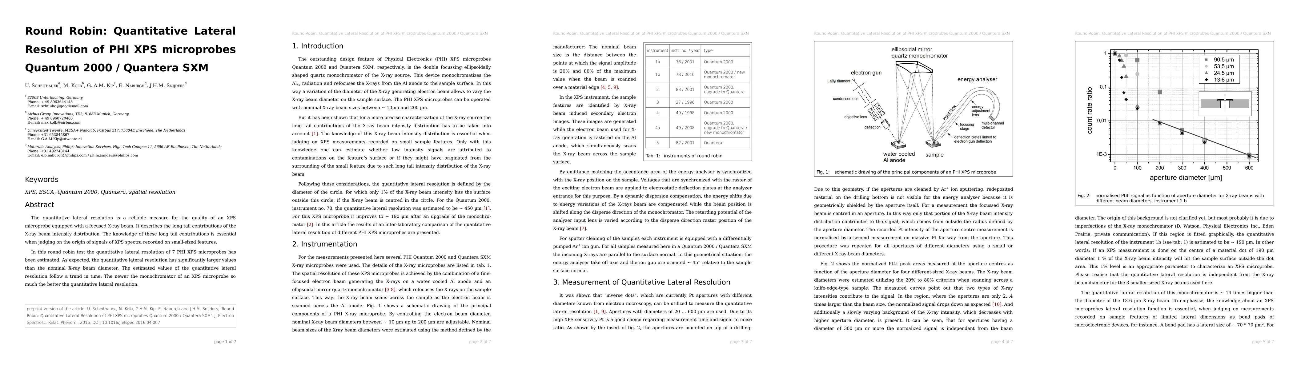 The quantitative lateral resolution is a reliable measure for the quality of an XPS microprobe equipped with a focused X-ray beam. It describes the long tail contributions of the X-ray beam intensity distribution. The knowledge of these long tail contributions is essential when judging on the origin of signals of XPS spectra recorded on small-sized features. In this round robin test the quantitative lateral resolution of 7 PHI XPS microprobes has been estimated. As expected, the quantitative lateral resolution has significantly larger values than the nominal X-ray beam diameter. The estimated values of the quantitative lateral resolution follow a trend in time: The newer the monochromator of an XPS microprobe so much the better the quantitative lateral resolution.