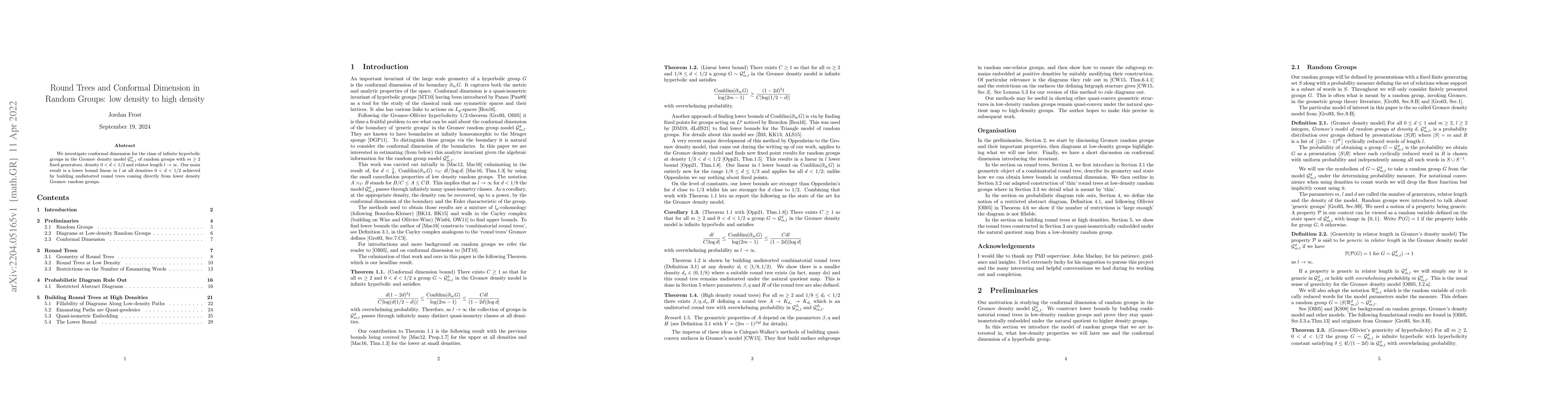 We investigate conformal dimension for the class of infinite hyperbolic groups in the Gromov density model $\mathcal{G}^d_{m,l}$ of random groups with $m \geq 2$ fixed generators, density $0 < d < 1/2$ and relator length $l \to \infty$. Our main result is a lower bound linear in $l$ at all densities $0 < d < 1/2$ achieved by building undistorted round trees coming directly from lower density Gromov random groups.