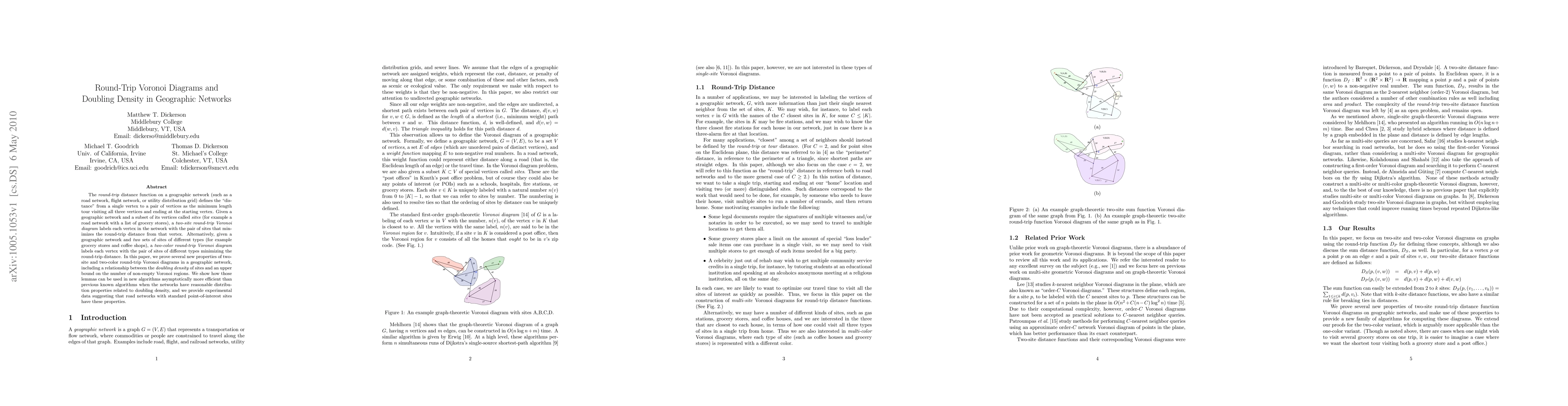 This paper explores round-trip Voronoi diagrams in geographic networks, proving new properties including a relationship between site doubling density and Voronoi region count. It introduces more efficient algorithms for constructing these diagrams, supported by experimental data indicating that typical road networks exhibit favorable distribution properties.