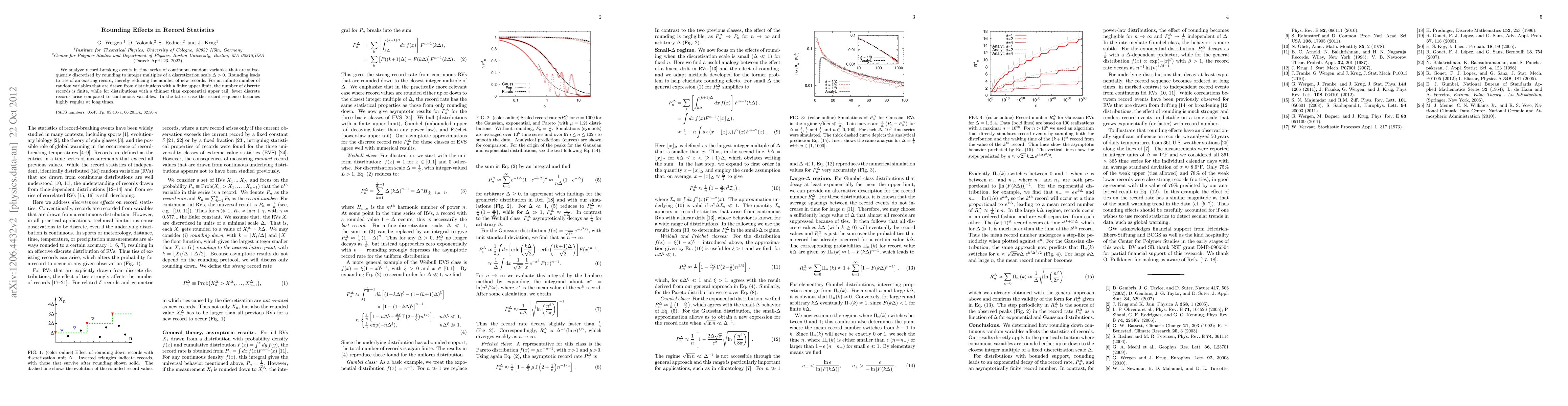 This research is important for understanding how rounding affects record statistics, particularly in practical situations where continuous variables are rounded to the closest integer multiple of a fixed discretization scale Δ. It has implications for fields like climate science, where rounding effects might influence the detection of secular trends in data, such as global warming.