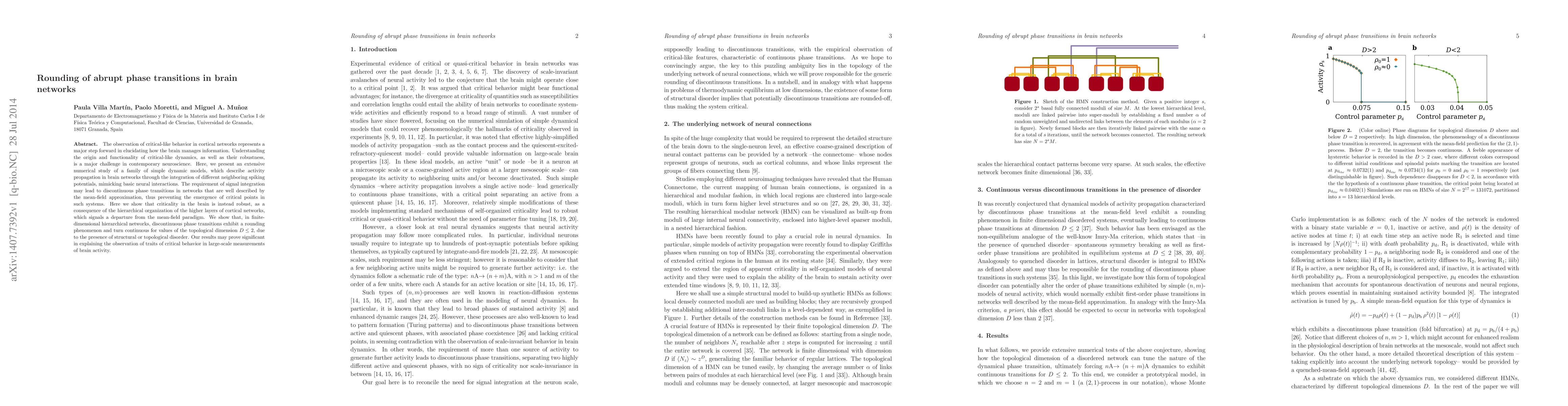 The observation of critical-like behavior in cortical networks represents a major step forward in elucidating how the brain manages information. Understanding the origin and functionality of critical-like dynamics, as well as their robustness, is a major challenge in contemporary neuroscience. Here, we present an extensive numerical study of a family of simple dynamic models, which describe activity propagation in brain networks through the integration of different neighboring spiking potentials, mimicking basic neural interactions. The requirement of signal integration may lead to discontinuous phase transitions in networks that are well described by the mean field approximation, thus preventing the emergence of critical points in such systems. Here we show that criticality in the brain is instead robust, as a consequence of the hierarchical organization of the higher layers of cortical networks, which signals a departure from the mean-field paradigm. We show that, in finite-dimensional hierarchical networks, discontinuous phase transitions exhibit a rounding phenomenon and turn continuous for values of the topological dimension $D\le 2$, due to the presence of structural or topological disorder. Our results may prove significant in explaining the observation of traits of critical behavior in large-scale measurements of brain activity.