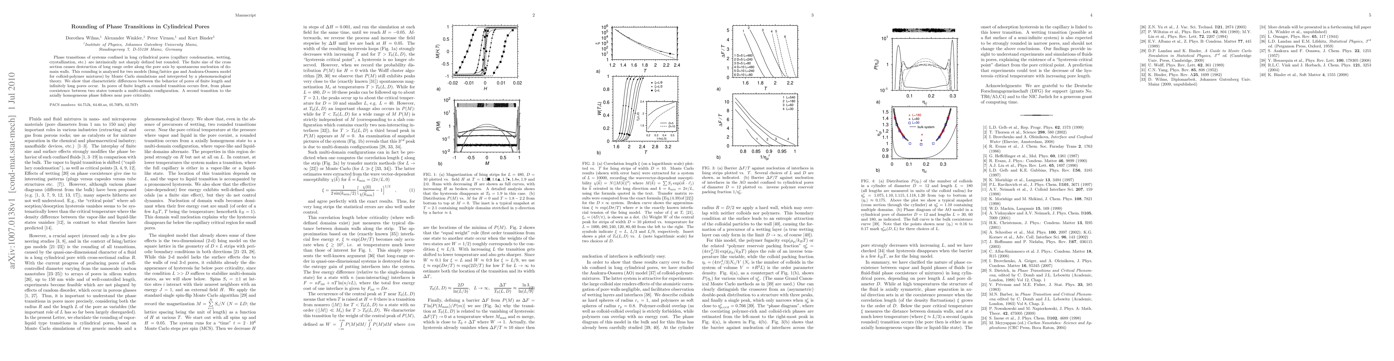 This paper investigates the rounding of phase transitions in cylindrical pores using Monte Carlo simulations and phenomenological theory, showing that finite pore length leads to a multi-domain configuration before a transition to an axially homogeneous phase near criticality. The study compares Ising/lattice gas and Asakura-Oosawa models for different systems.