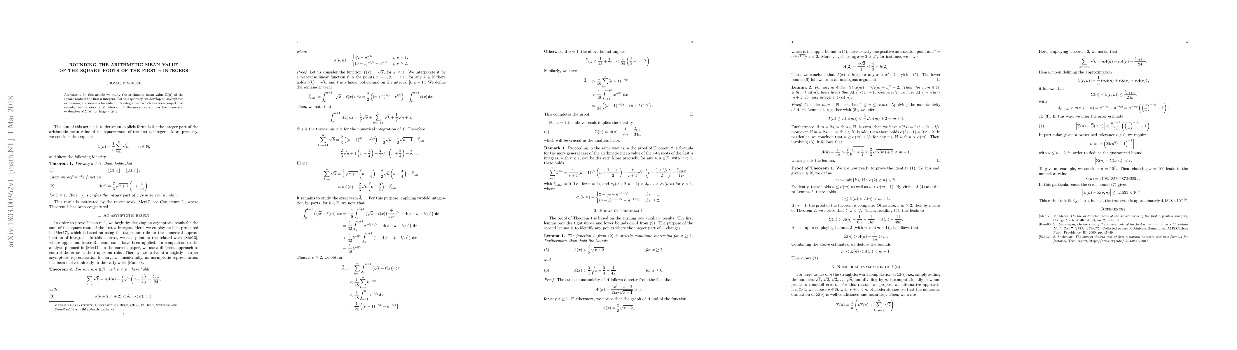 This research paper presents an asymptotic expression for the arithmetic mean value of square roots of the first n integers, $Sigma(n)$. It also provides a formula for the integer part of $Sigma(n)$, verifying a recent conjecture, and discusses numerical evaluation methods for large n.